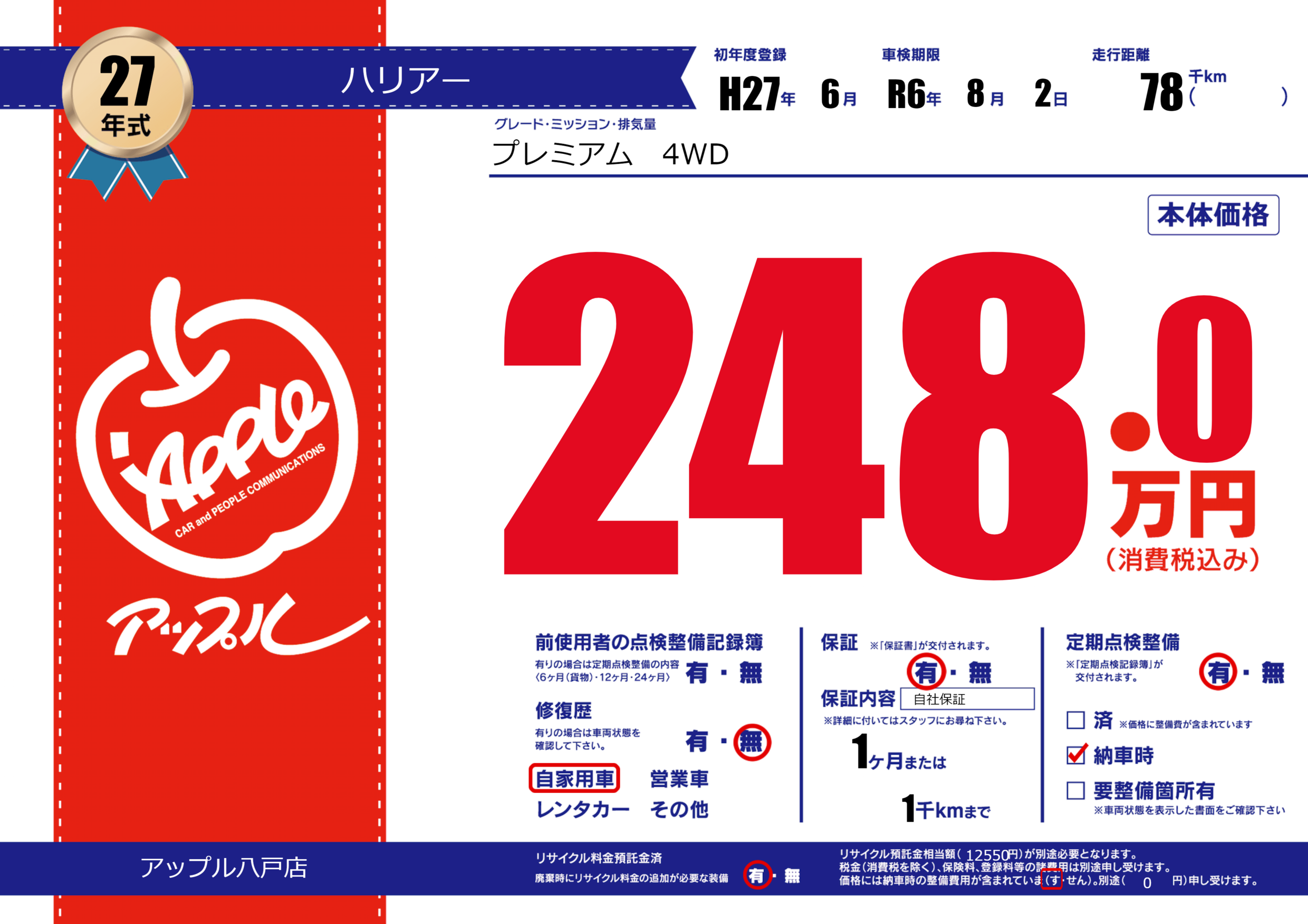 | 走行キロ | 7.8万km | 初年度登録 | H27年6月 |
