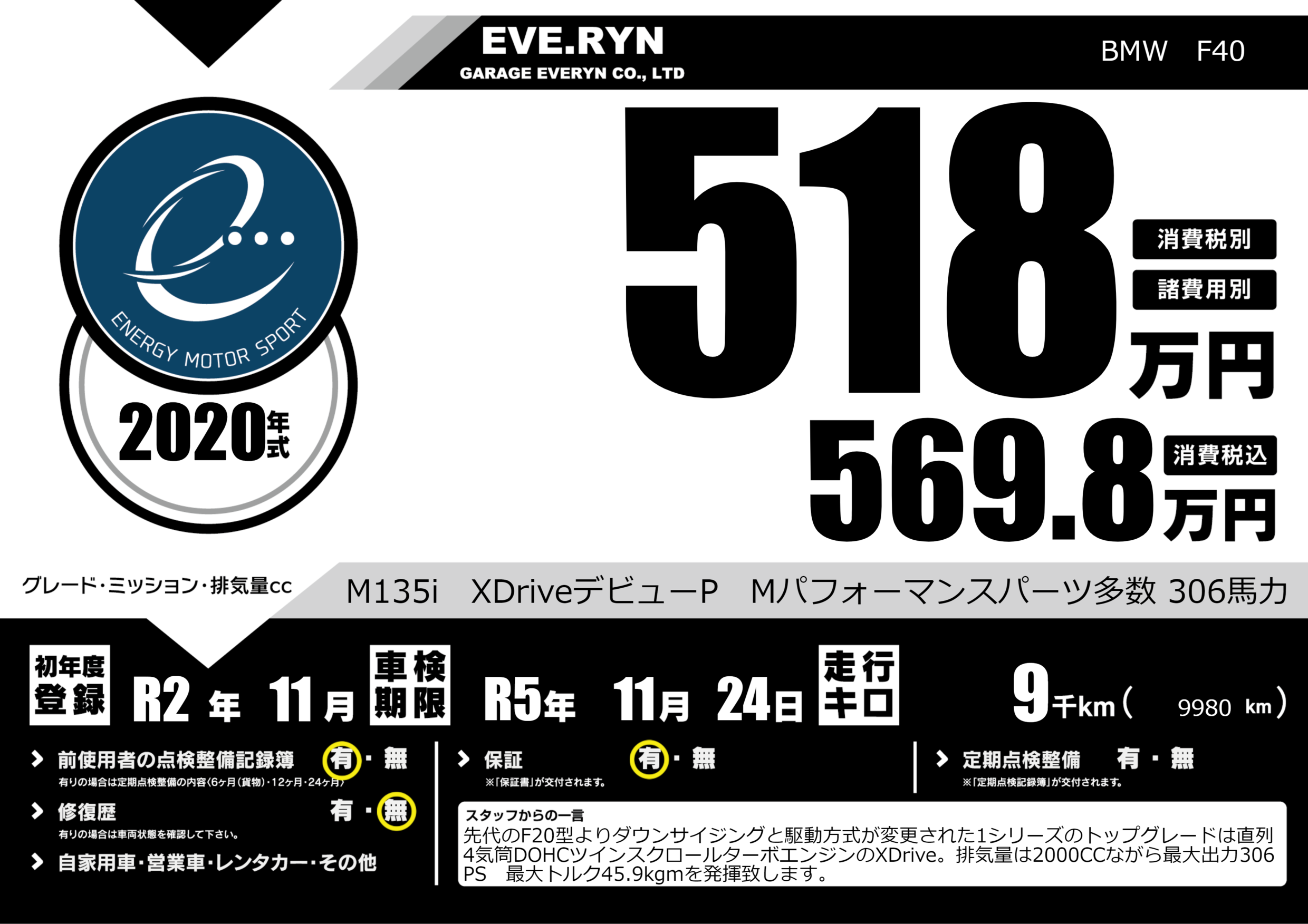 | 車名 | BMW F40 | グレード ミッション 排気量 |