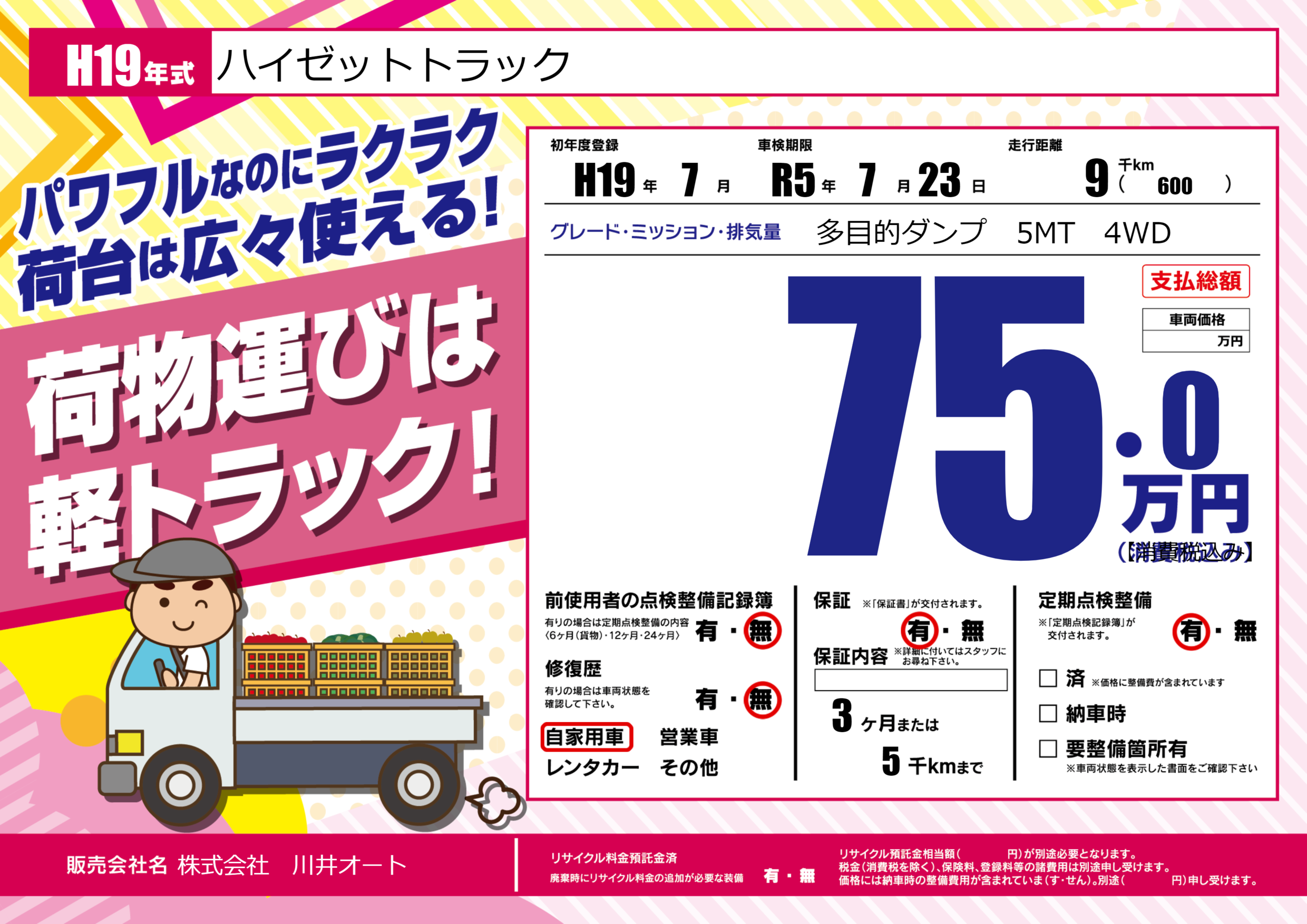 | 車名 | ハイゼットトラック | グレード ミッション 排気量 |