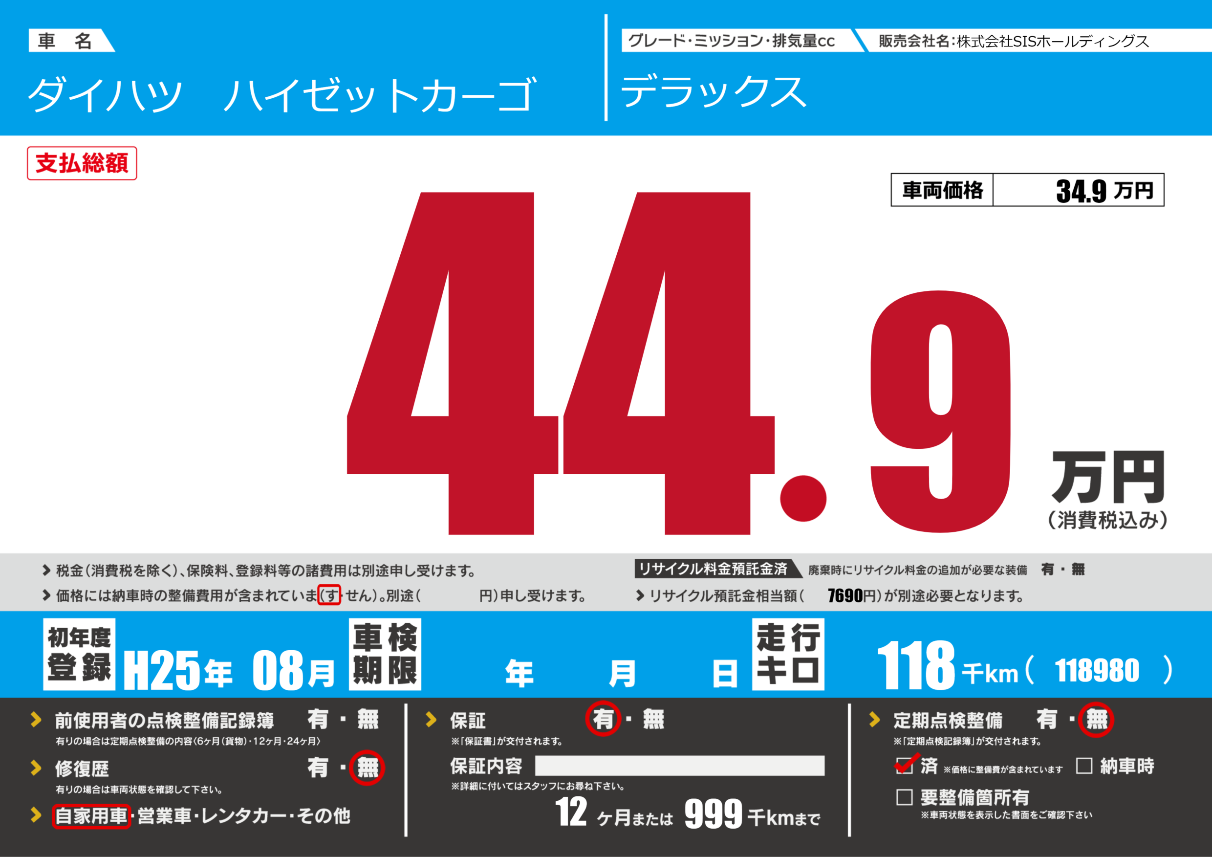 | 定期点検整備 | 定期点検整備なし 定期点検整備済み | ||
