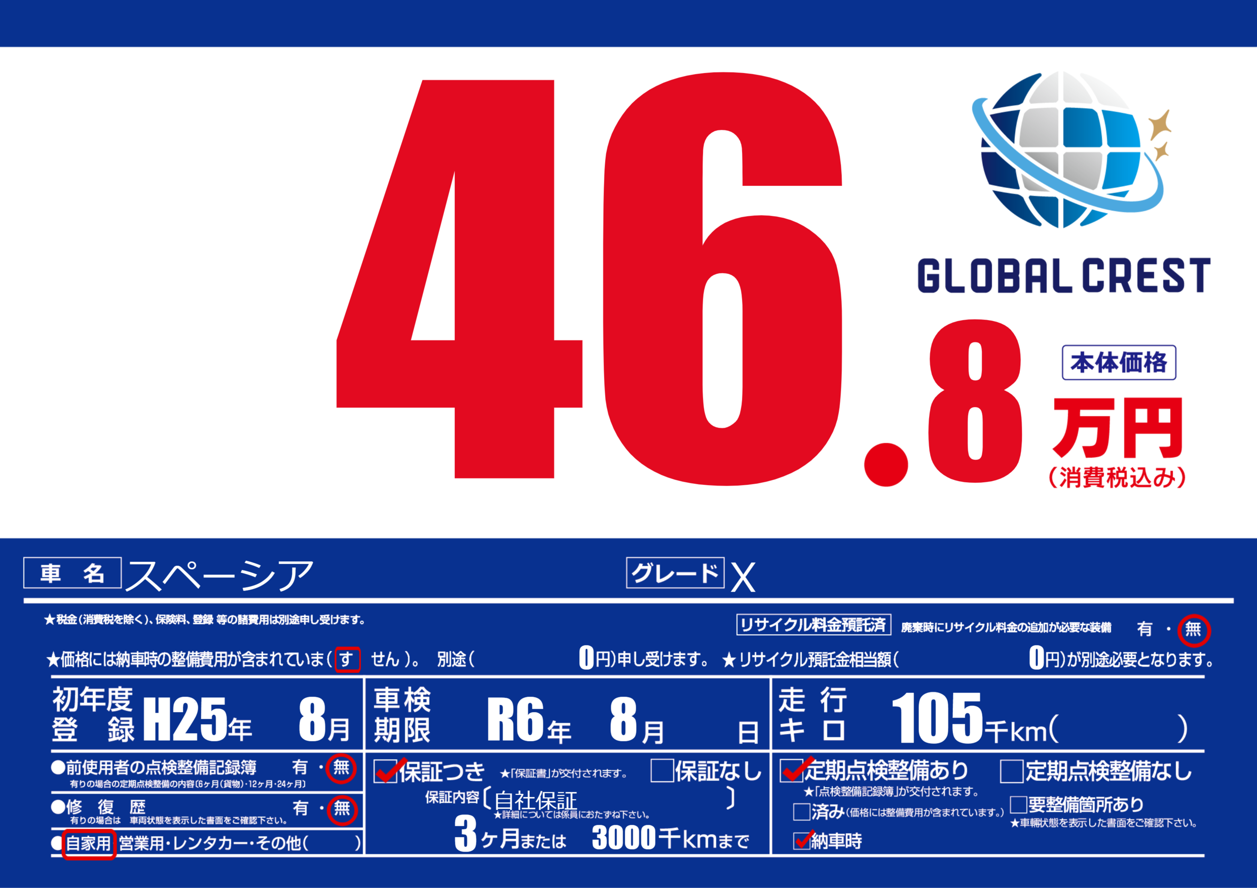 | 車名 | スペーシア | グレード ミッション 排気量 |