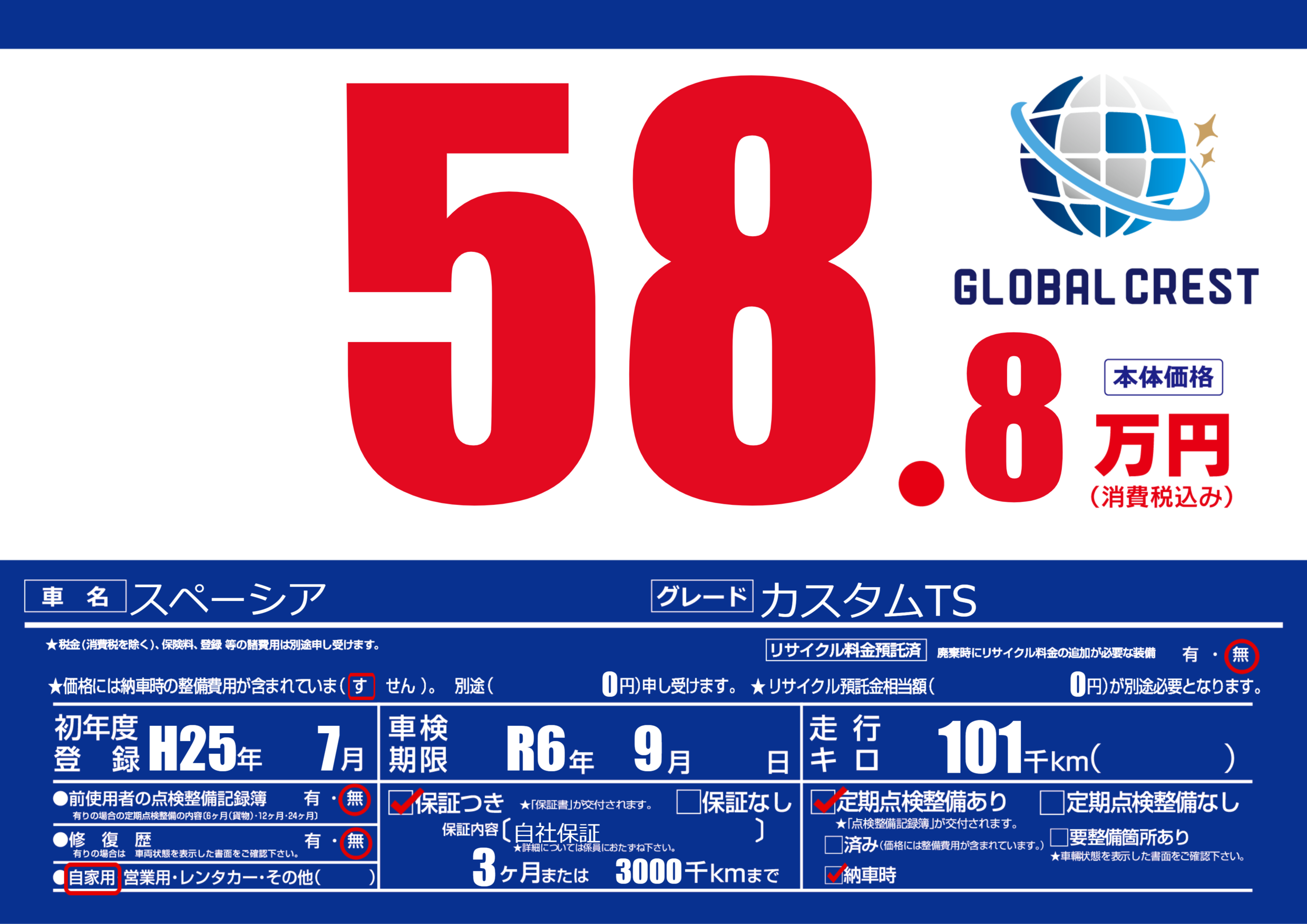 | 車名 | スペーシア | グレード ミッション 排気量 |