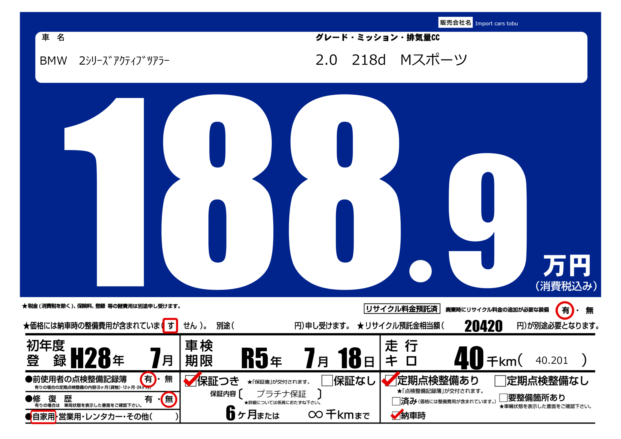 | 車名 | BMW 2シリーズアクティブツアラー | グレード ミッション 排気量 |