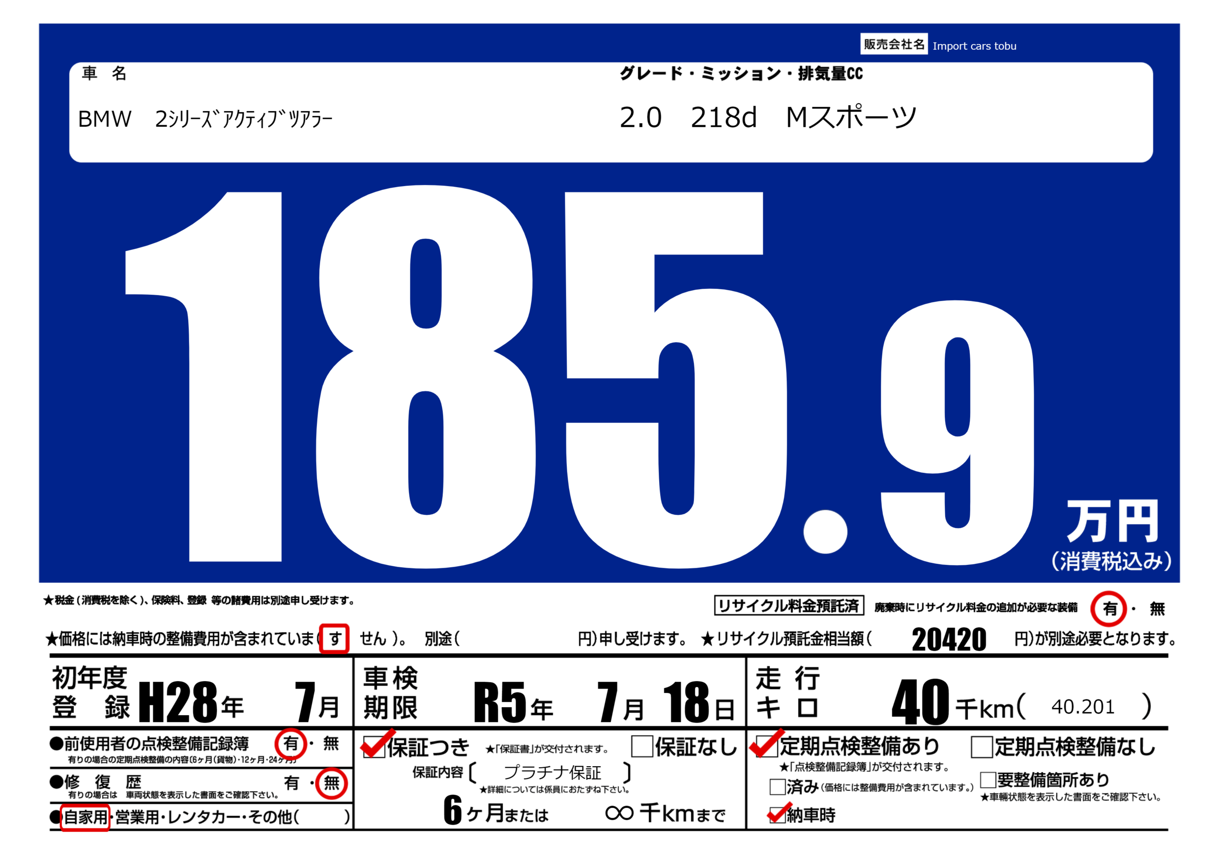 保証付き 保証内容( プラチナ保証) 6ヶ月または(∞)千kmまで |