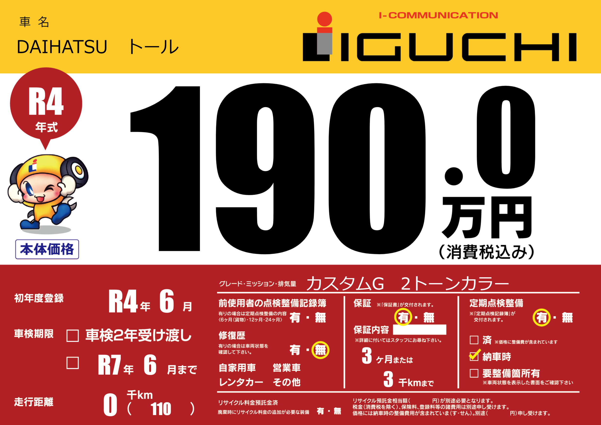 | 車名 | DAIHATSU トール | グレード ミッション 排気量 |