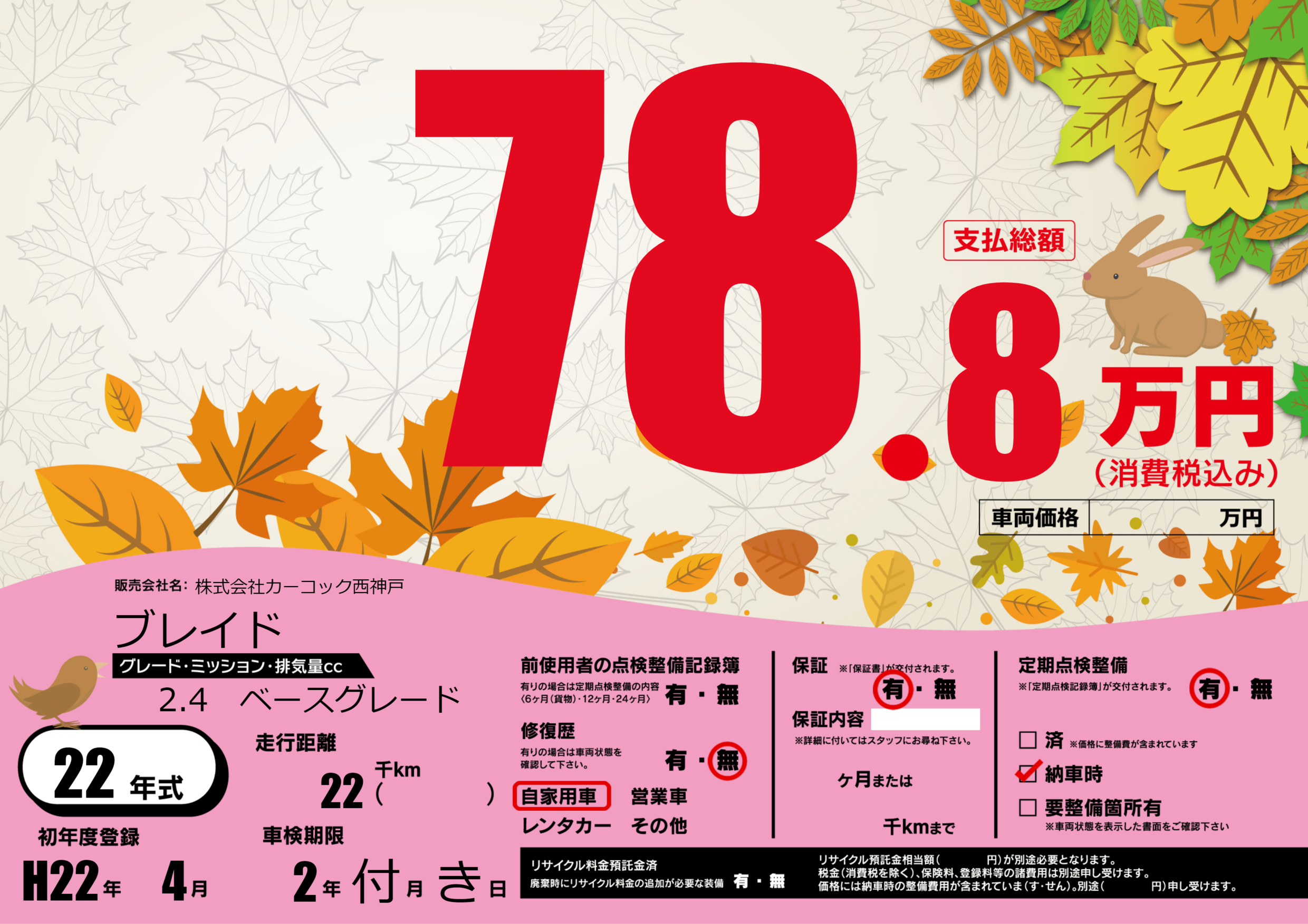 | 走行キロ | 2.2万km | 初年度登録 | H22年4月 |