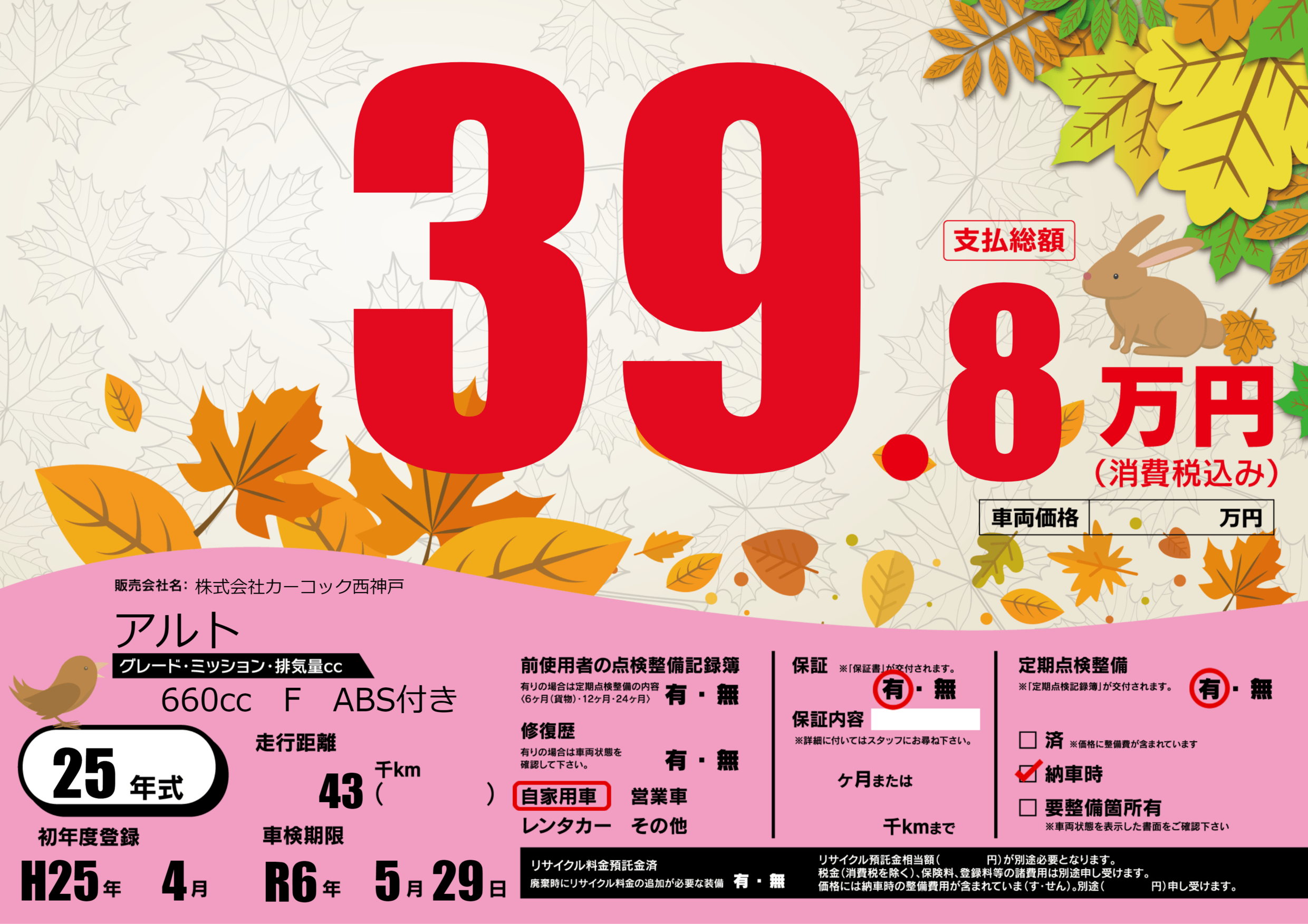 | 定期点検整備 | 定期点検整備あり 納車時あり | ||