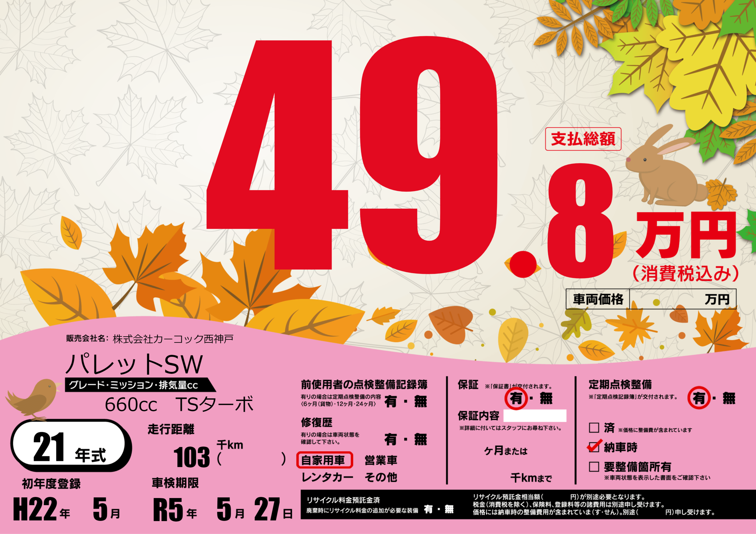 | 走行キロ | 10.3万km | 初年度登録 | H22年5月 |
