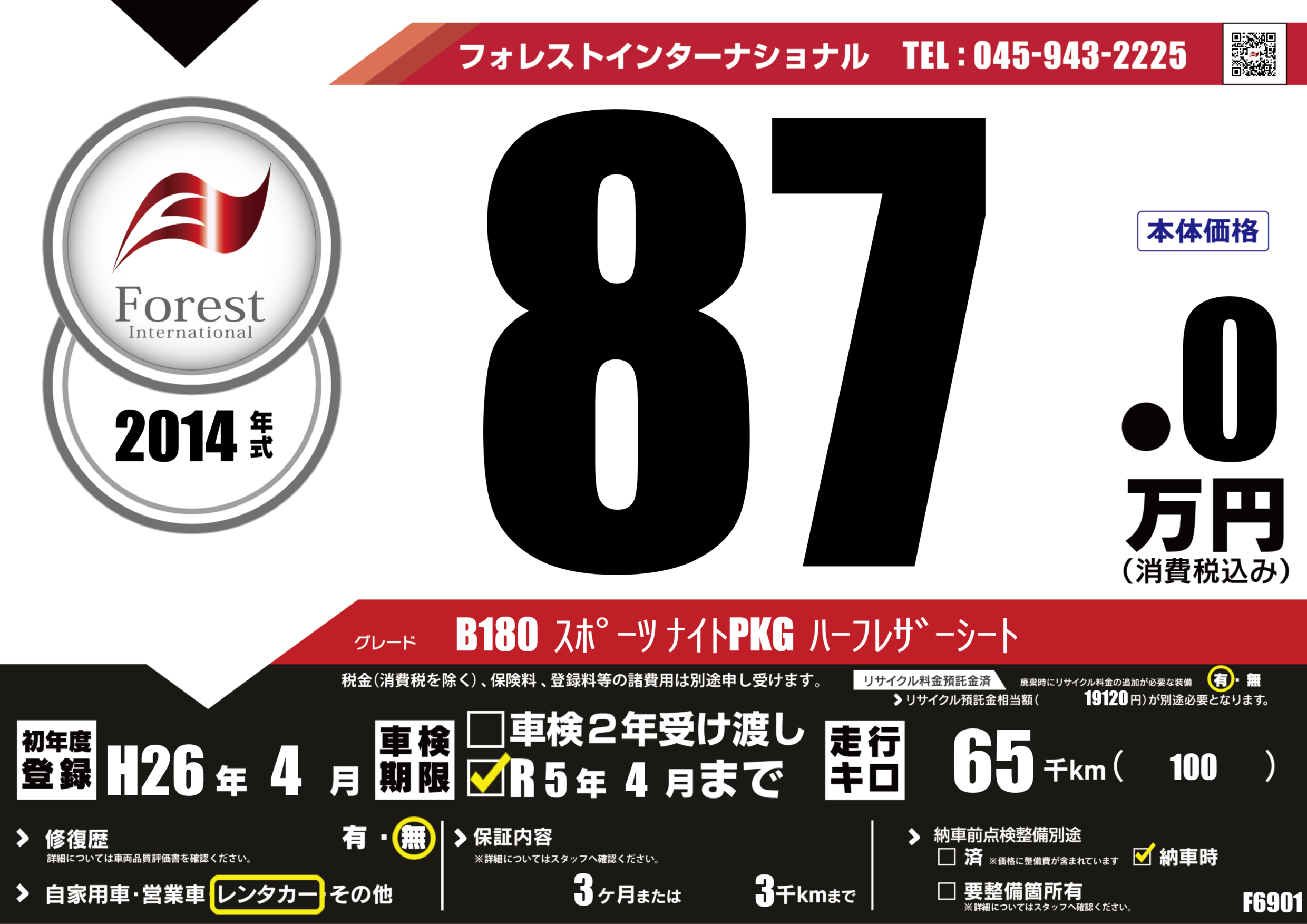 | 走行キロ | 6.5万km | 初年度登録 | H26年4月 |