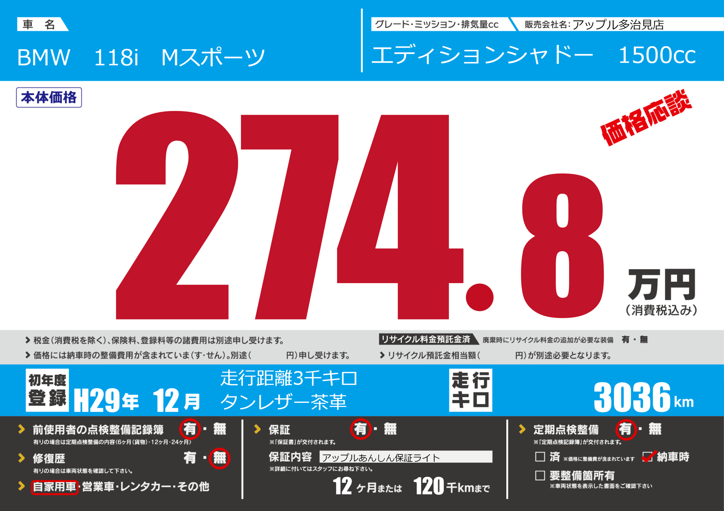 | 車名 | BMW 118i Mスポーツ | グレード ミッション 排気量 |