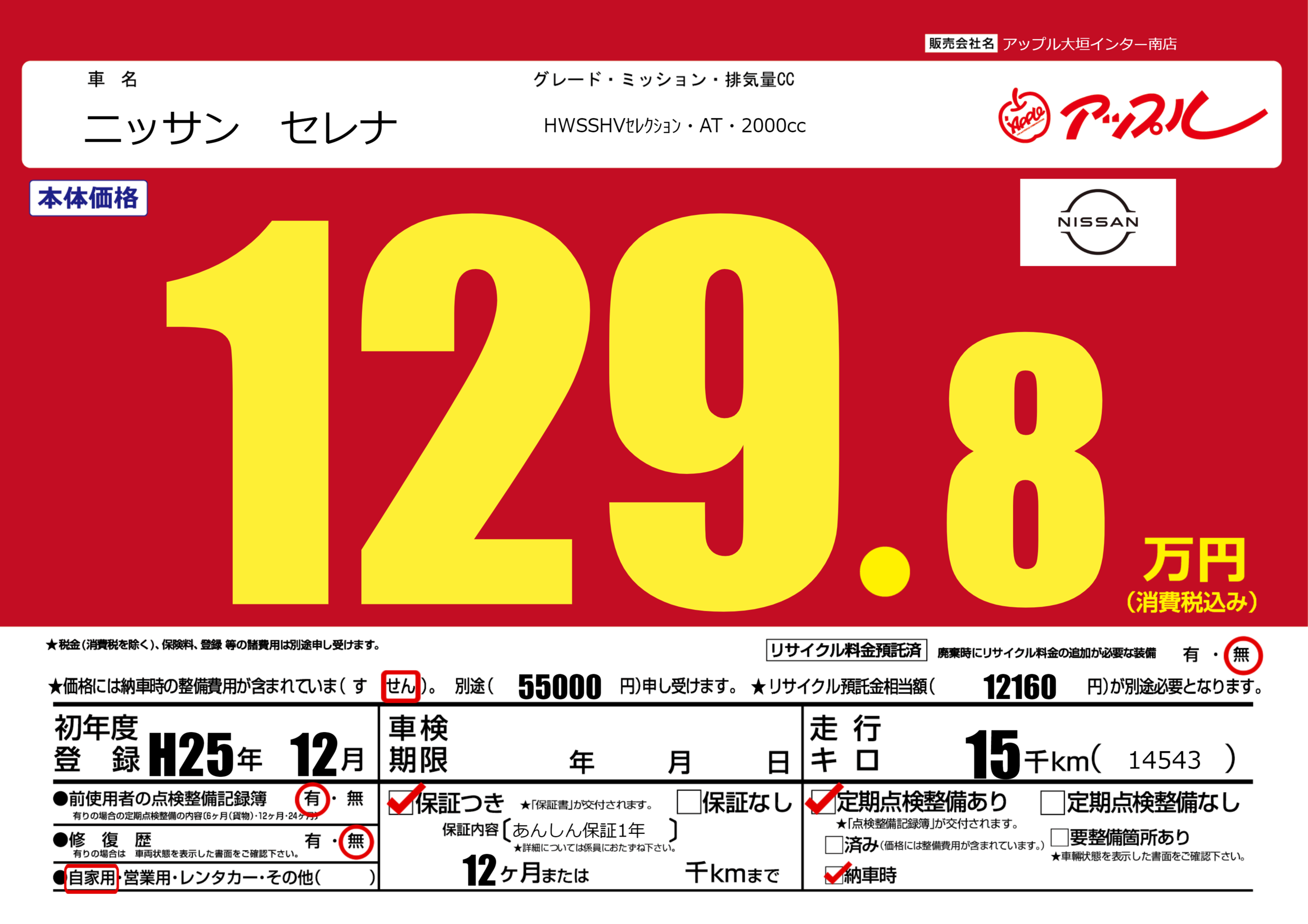 | 車名 | ニッサン セレナ | グレード ミッション 排気量 |