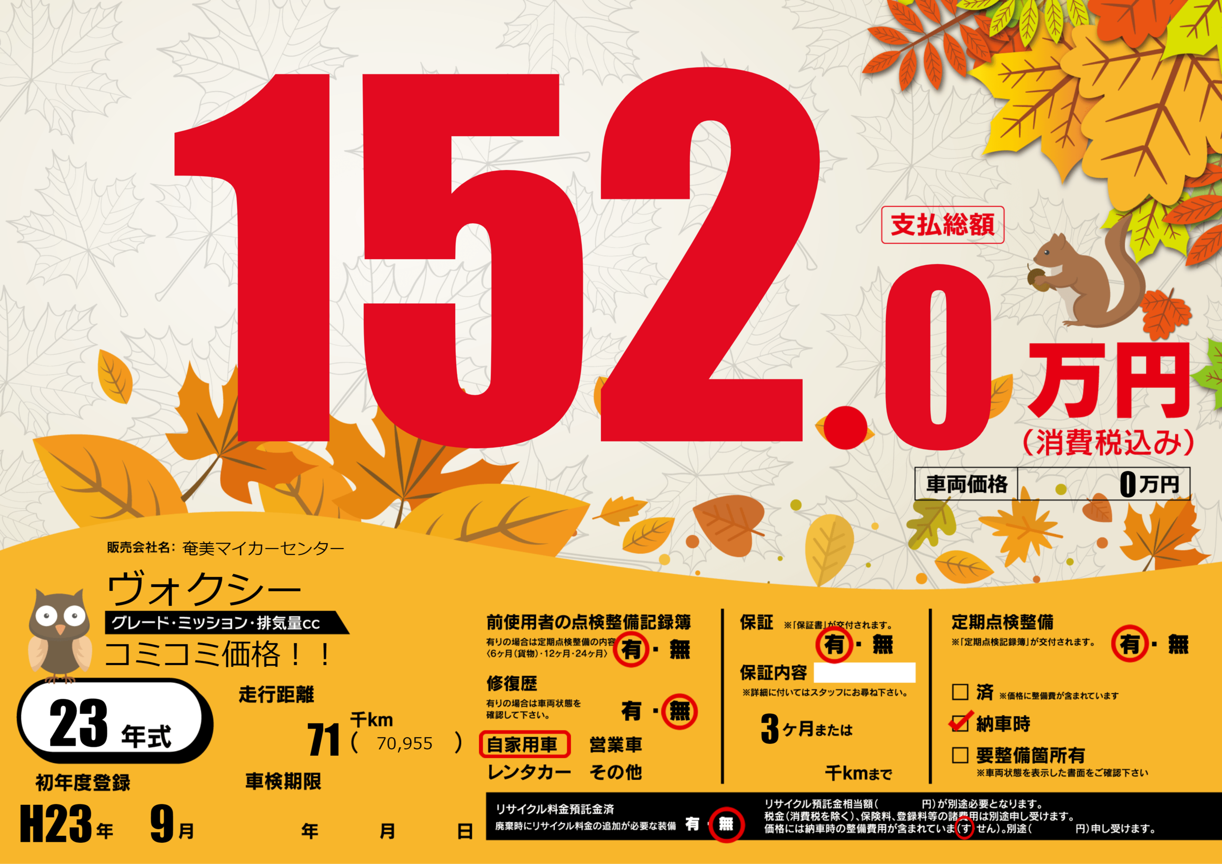 | 走行キロ | 7.1万km | 初年度登録 | H23年9月 |