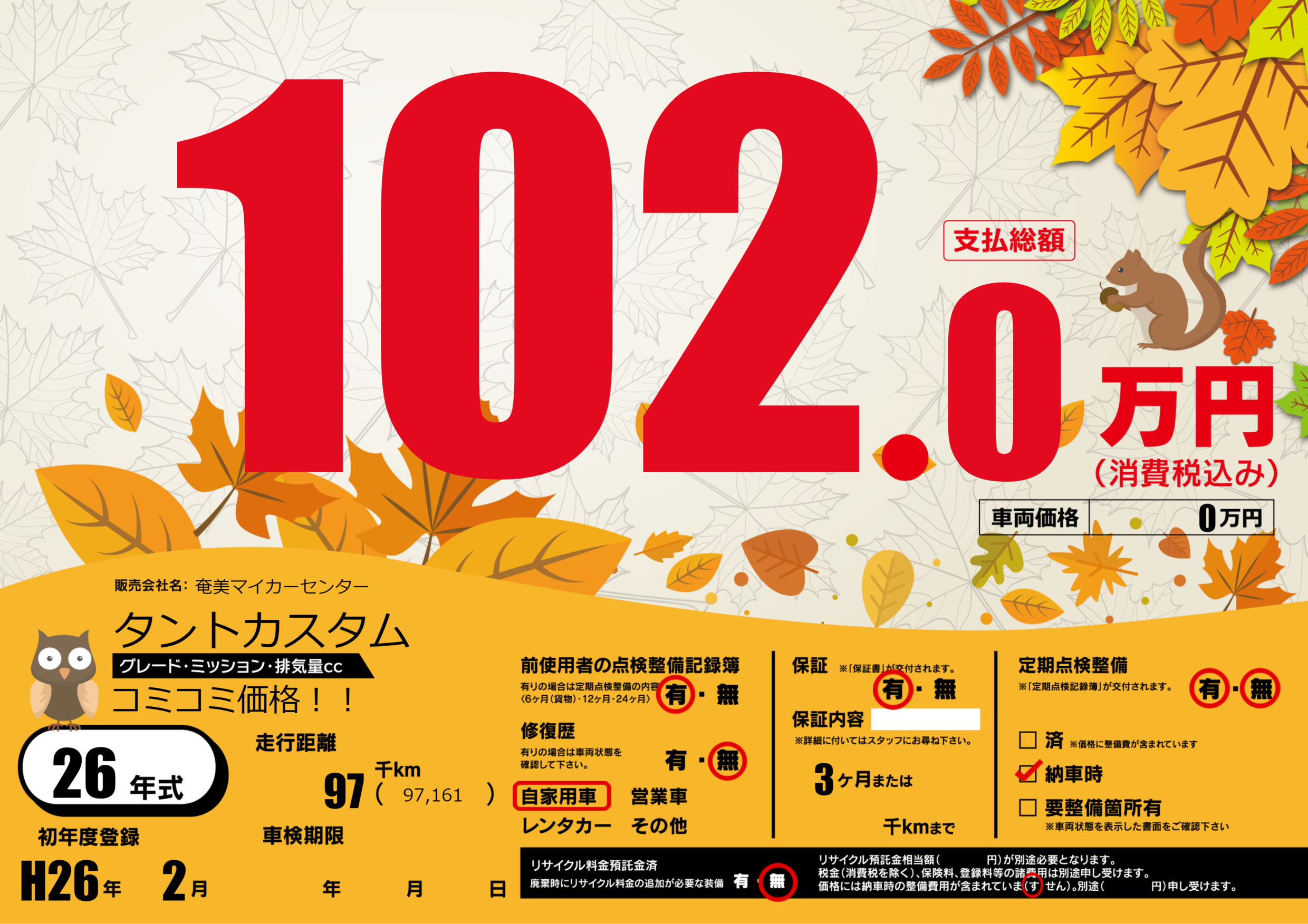 | 車名 | タントカスタム | グレード ミッション 排気量 |