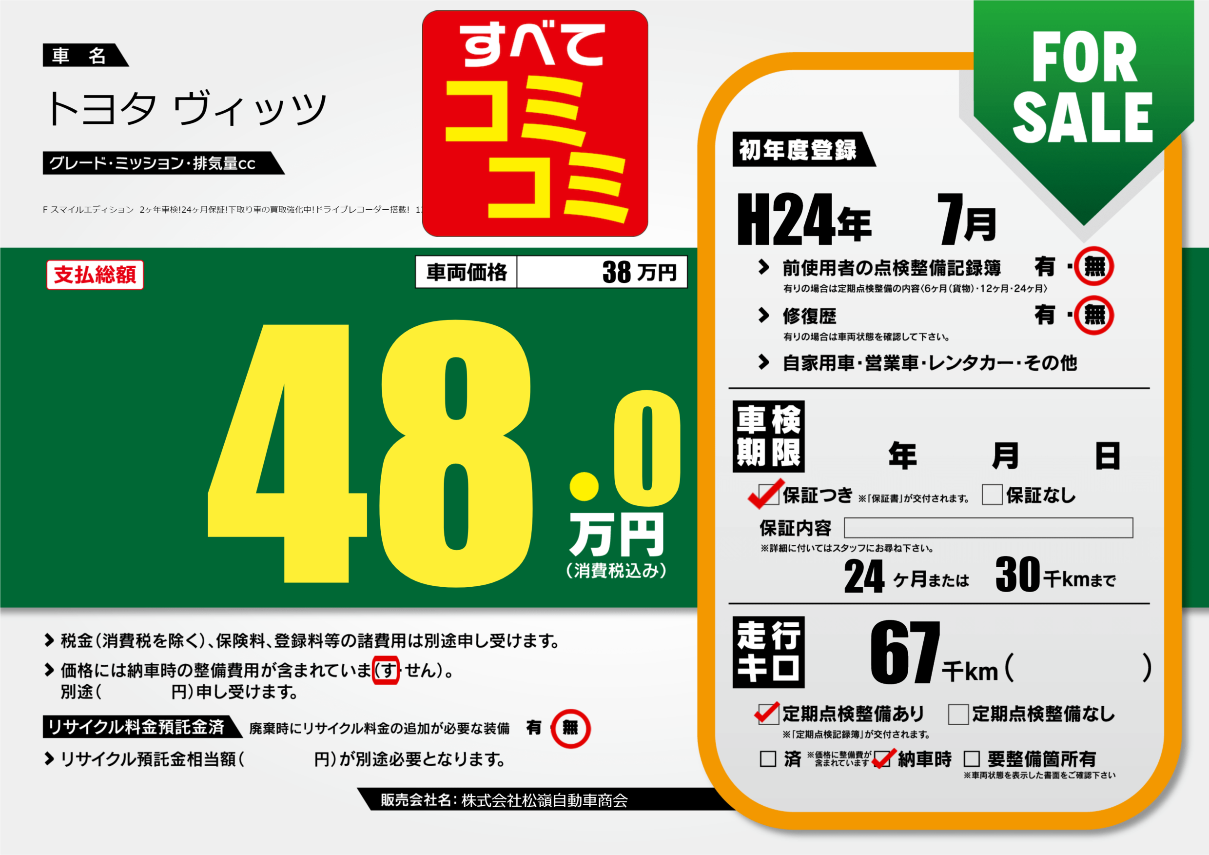 保証付き 保証内容(---) 24ヶ月または(30)千kmまで |