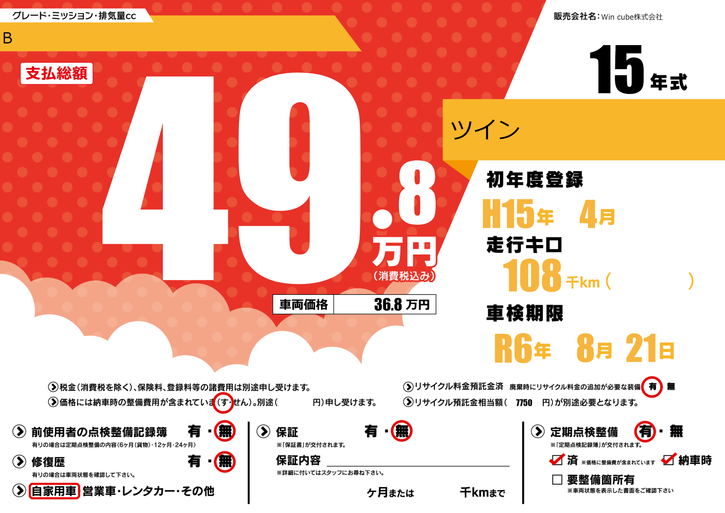 | 定期点検整備 | 定期点検整備あり 定期点検整備済み 納車時あり | ||