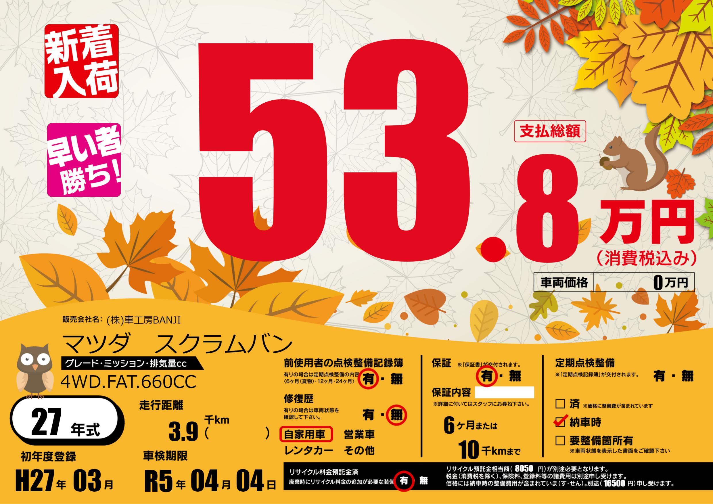 | 車名 | マツダ スクラムバン | グレード ミッション 排気量 |