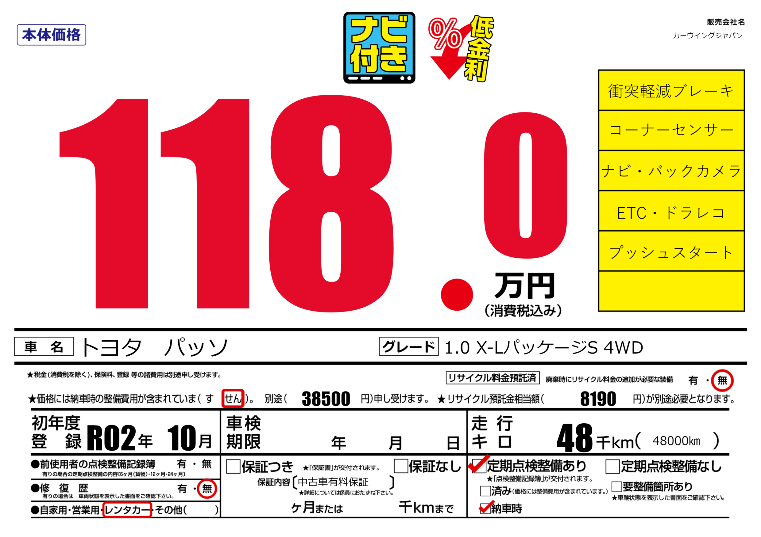 | 定期点検整備 | 定期点検整備あり 納車時あり | ||