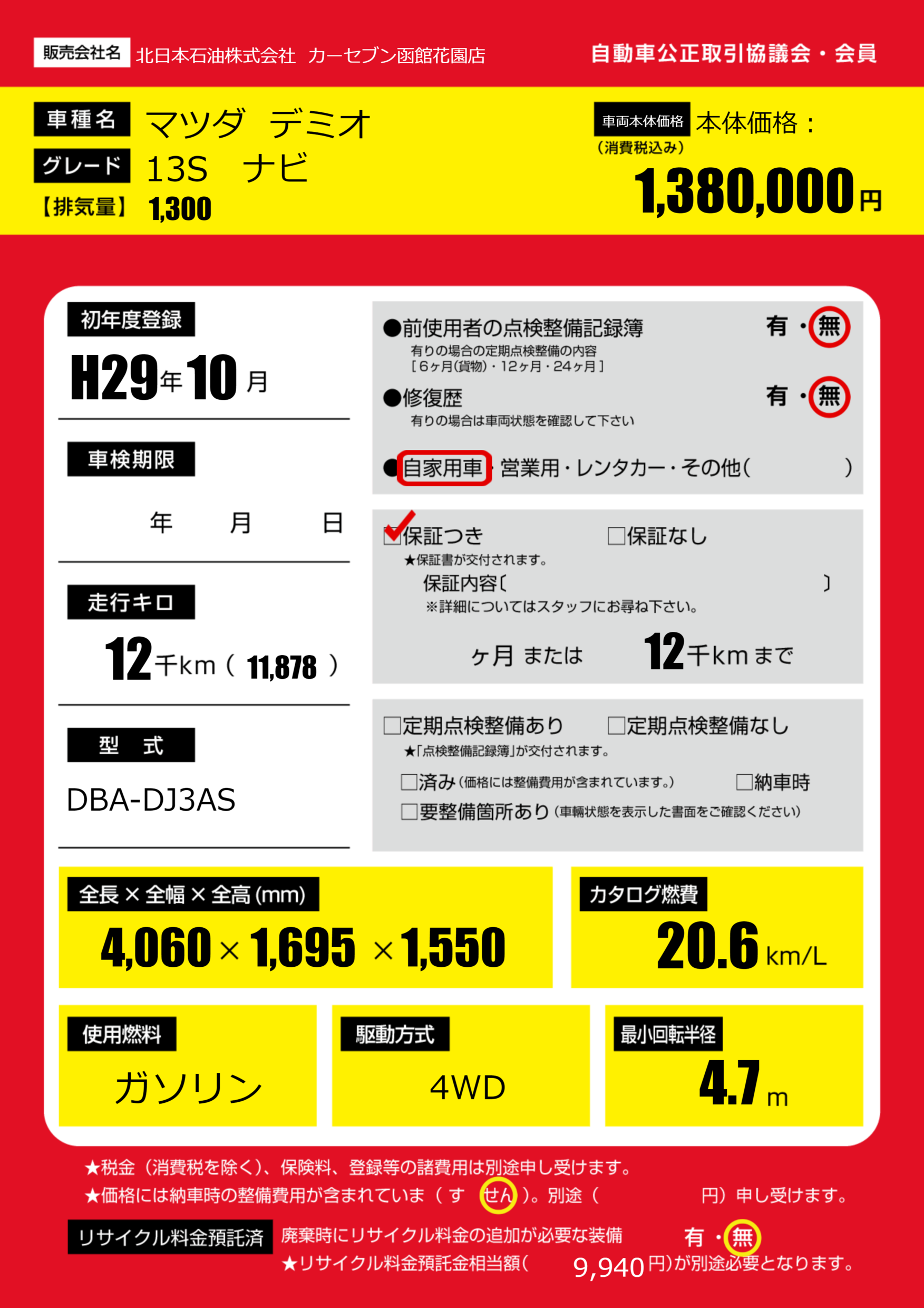| 車名 | マツダ デミオ | グレード ミッション 排気量 |