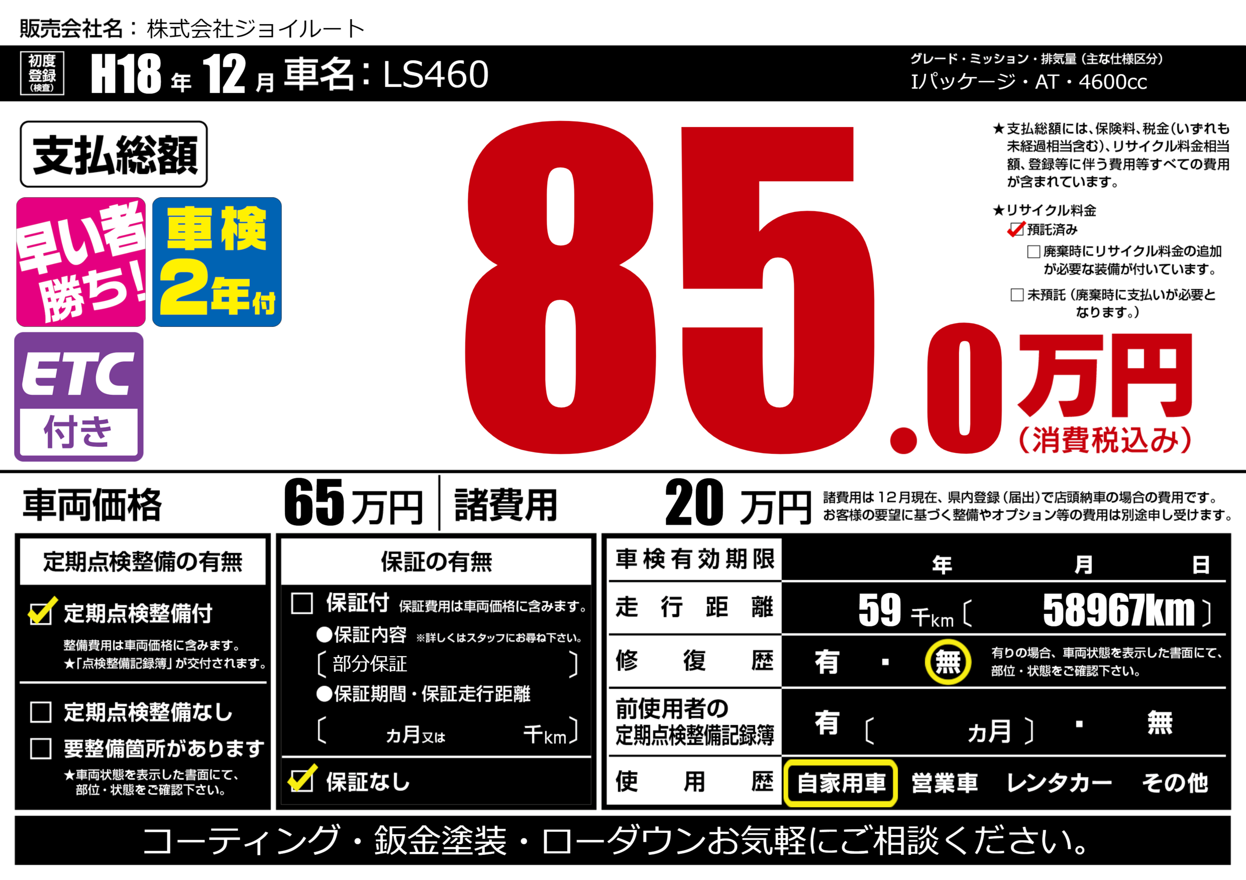 | 車名 | LS460 | グレード ミッション 排気量 |