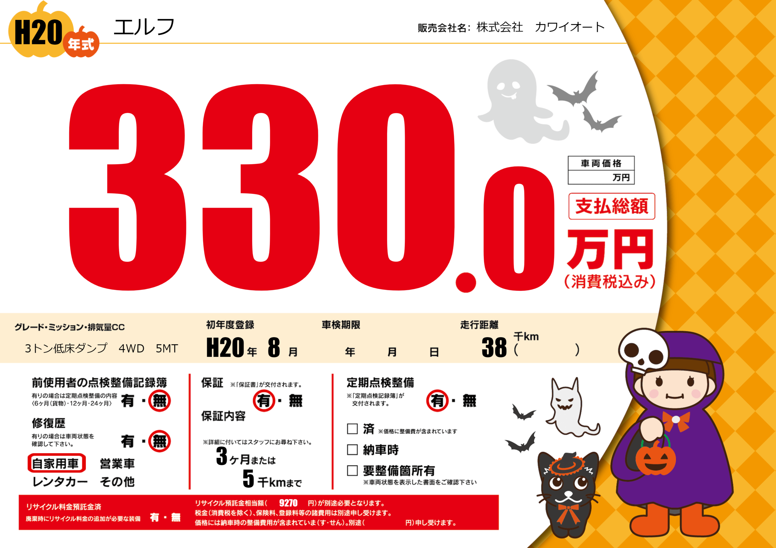 | 走行キロ | 3.8万km | 初年度登録 | H20年8月 |