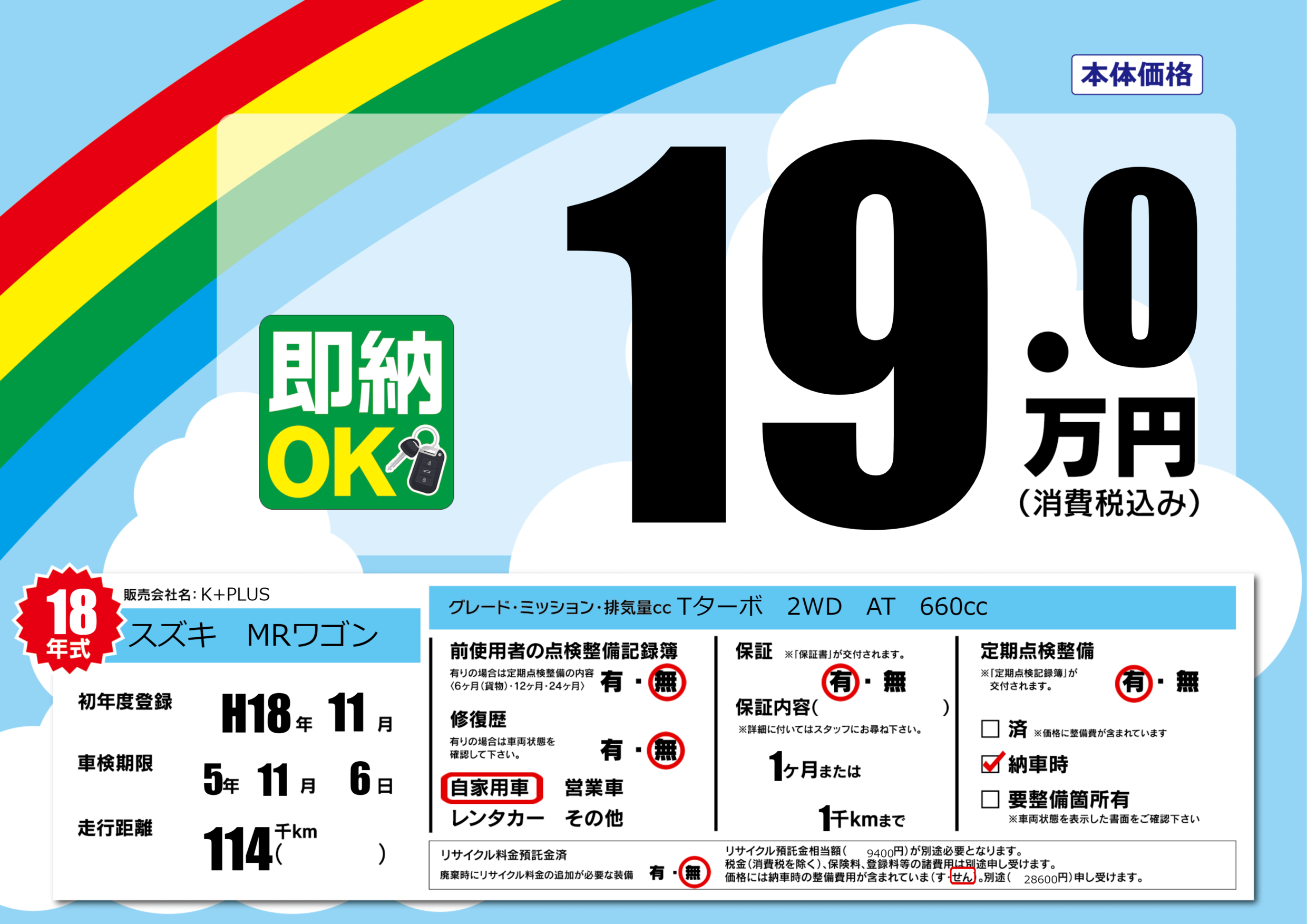 | 定期点検整備 | 定期点検整備あり 納車時あり | ||