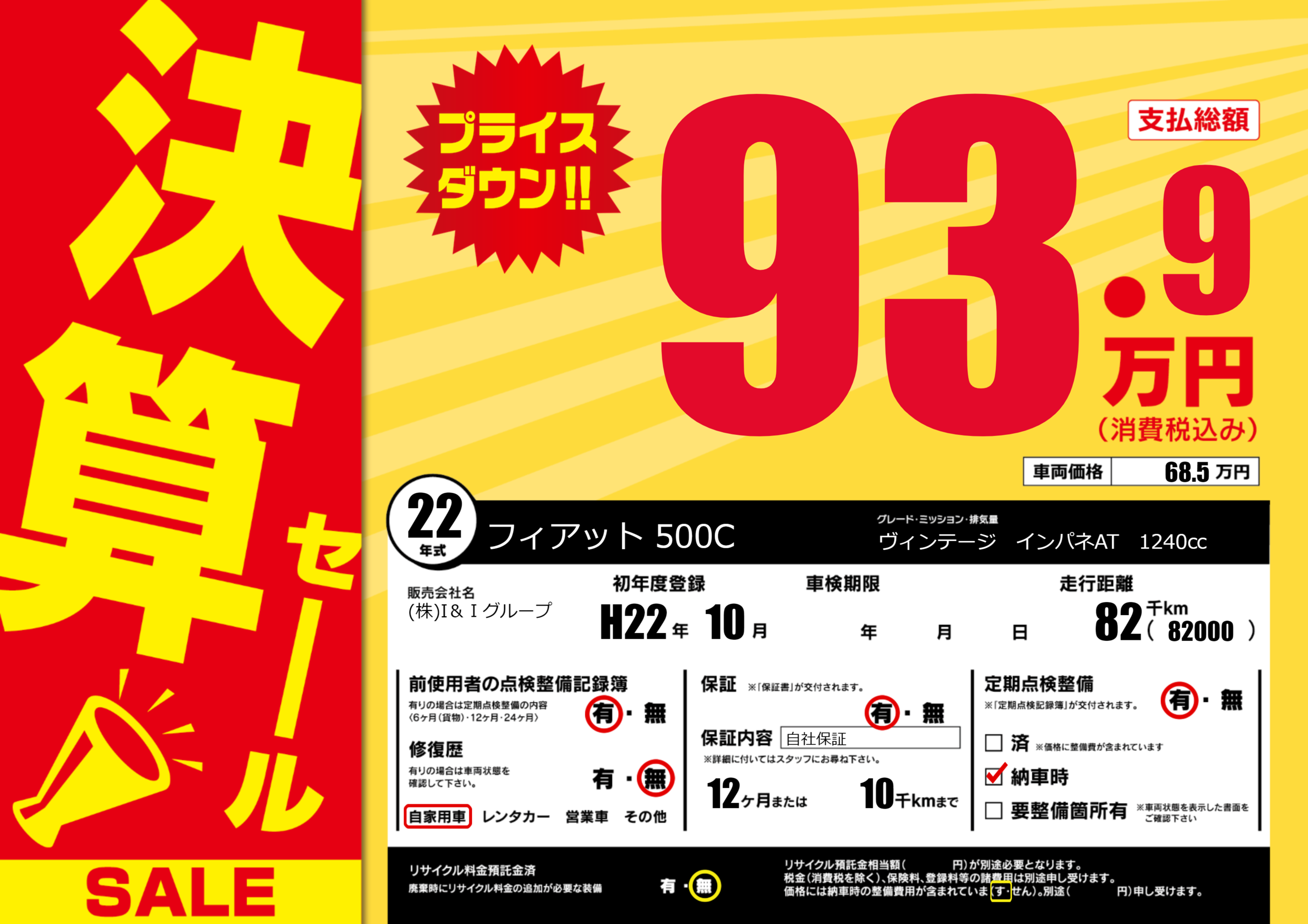 | 車名 | フィアット 500C | グレード ミッション 排気量 |
