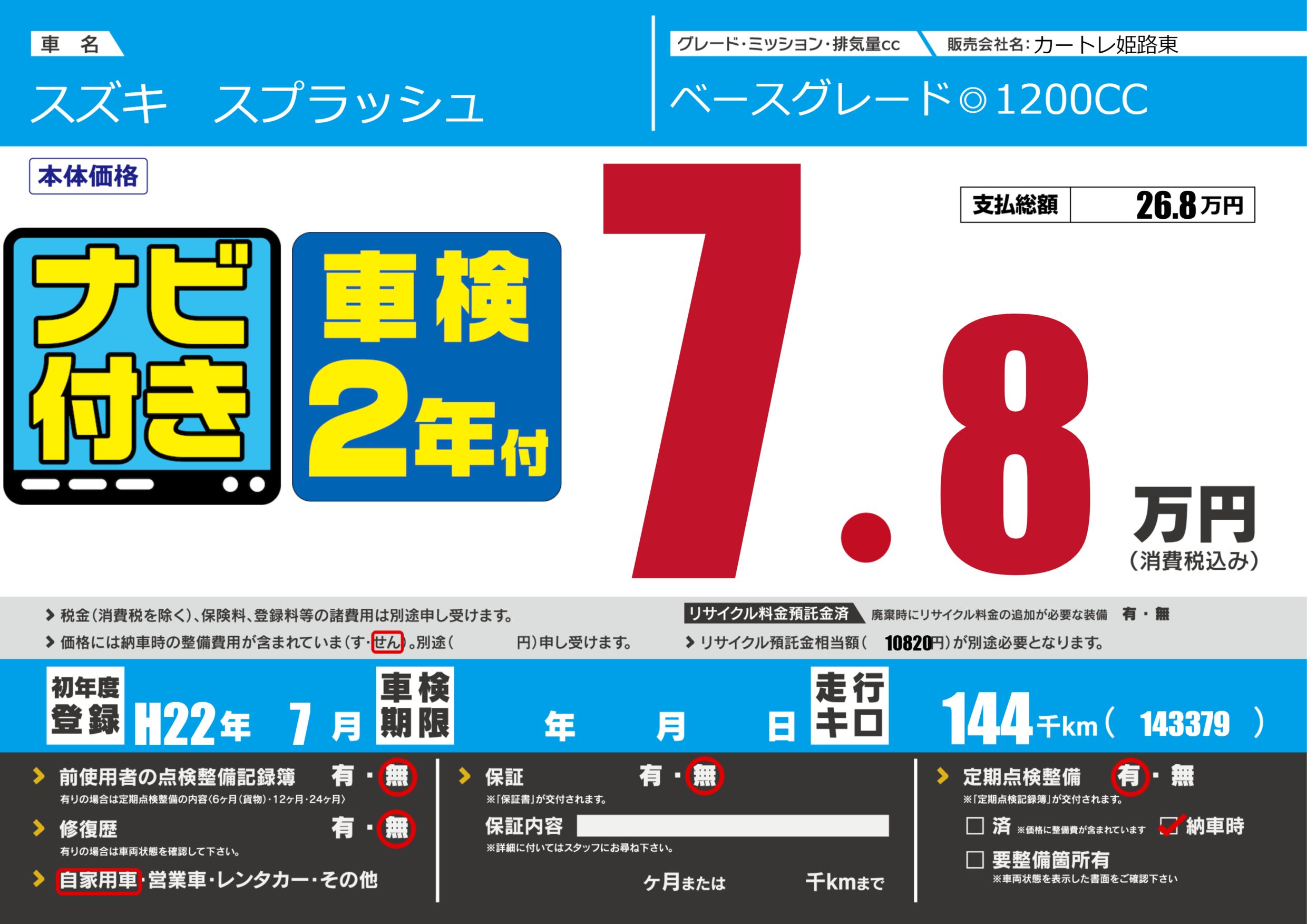 | 走行キロ | 14.4万km | 初年度登録 | H22年7月 |