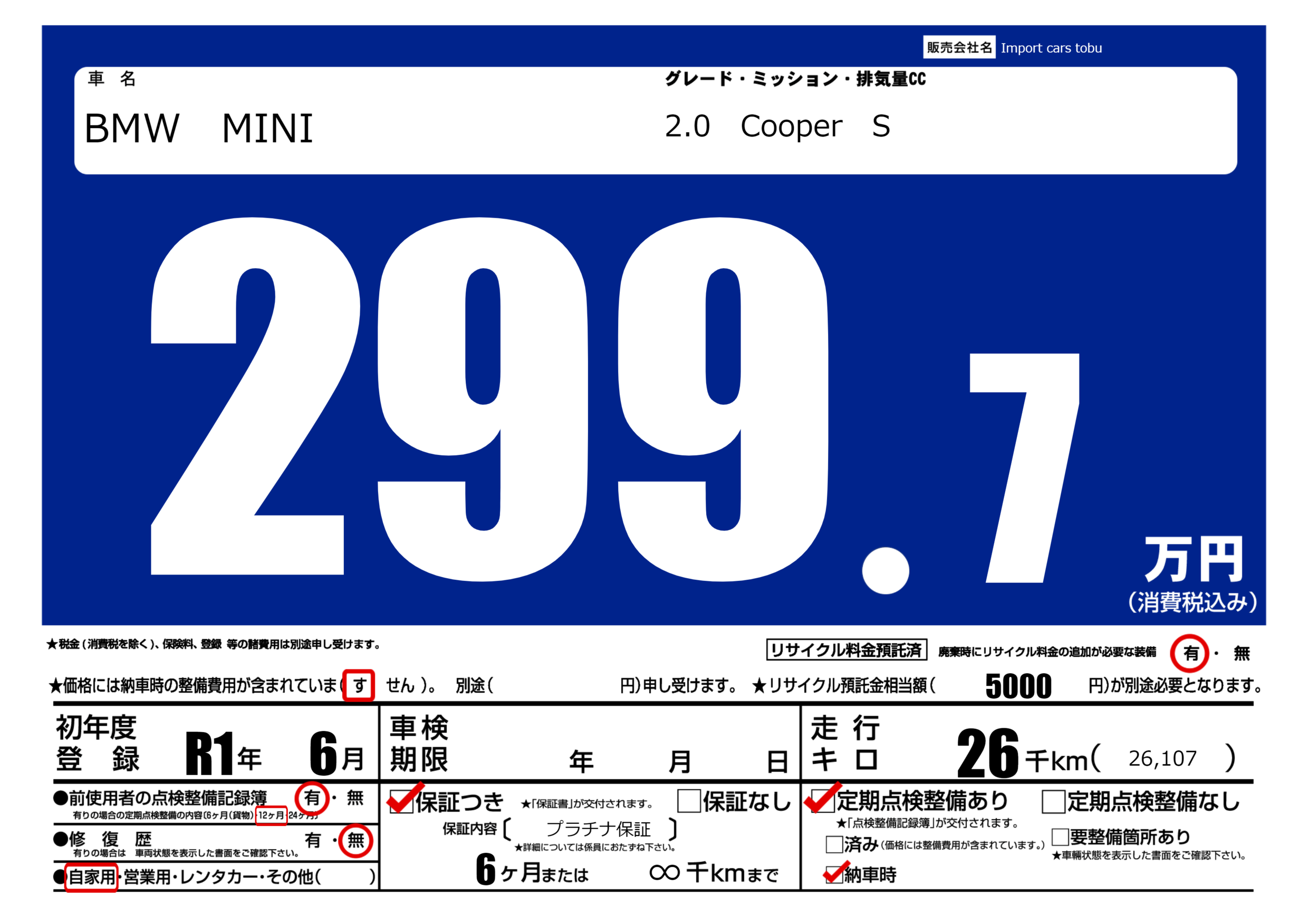 | 車名 | BMW MINI | グレード ミッション 排気量 |