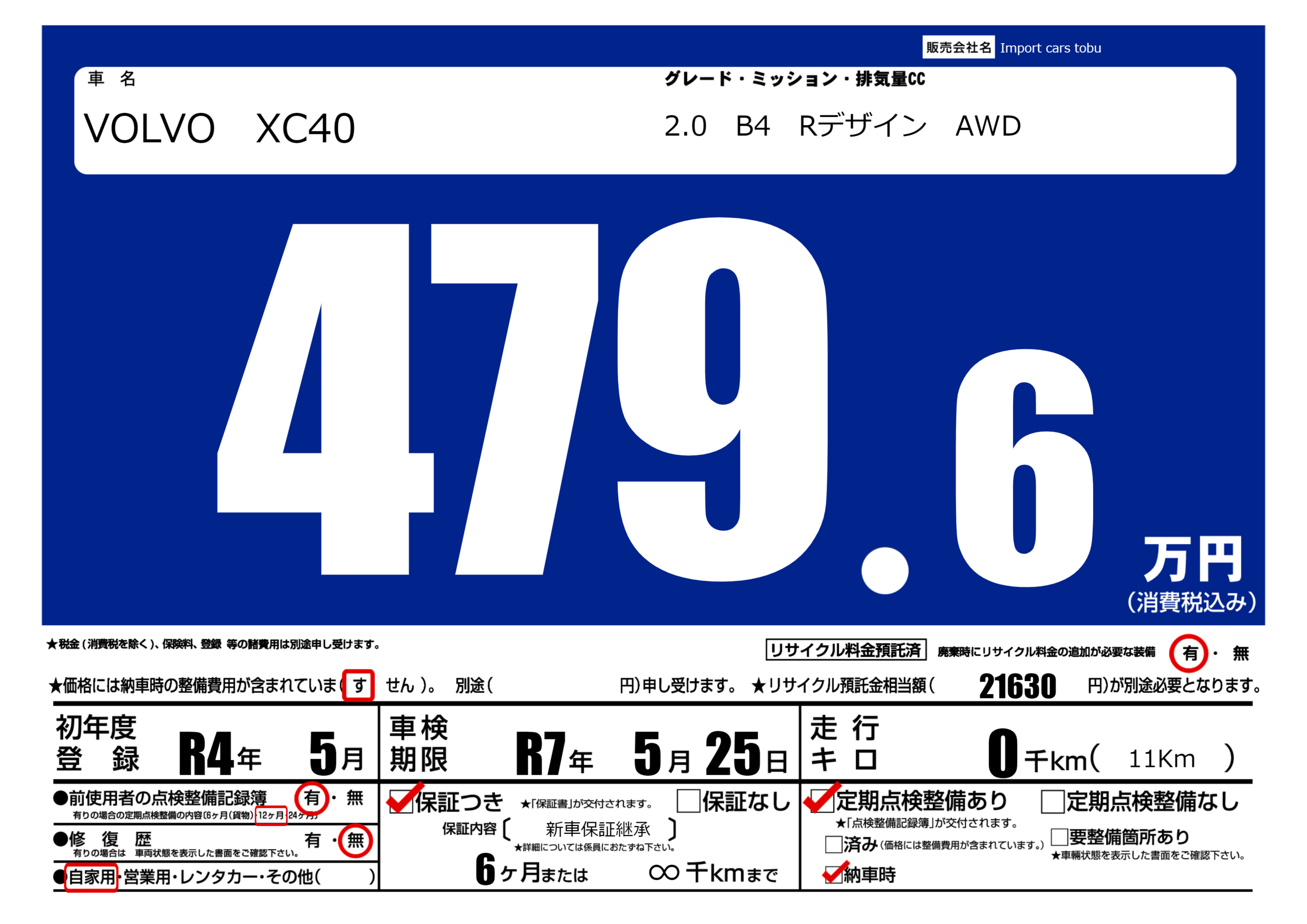 保証付き 保証内容( 新車保証継承) 6ヶ月または(∞)千kmまで |