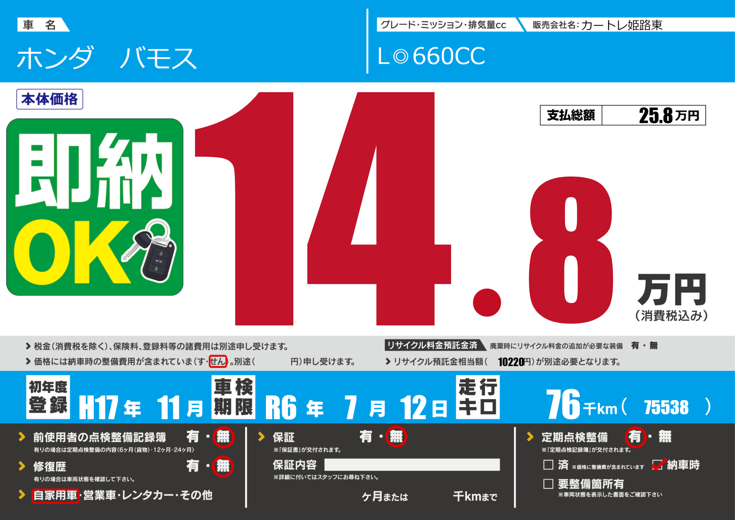 | 車名 | ホンダ バモス | グレード ミッション 排気量 |