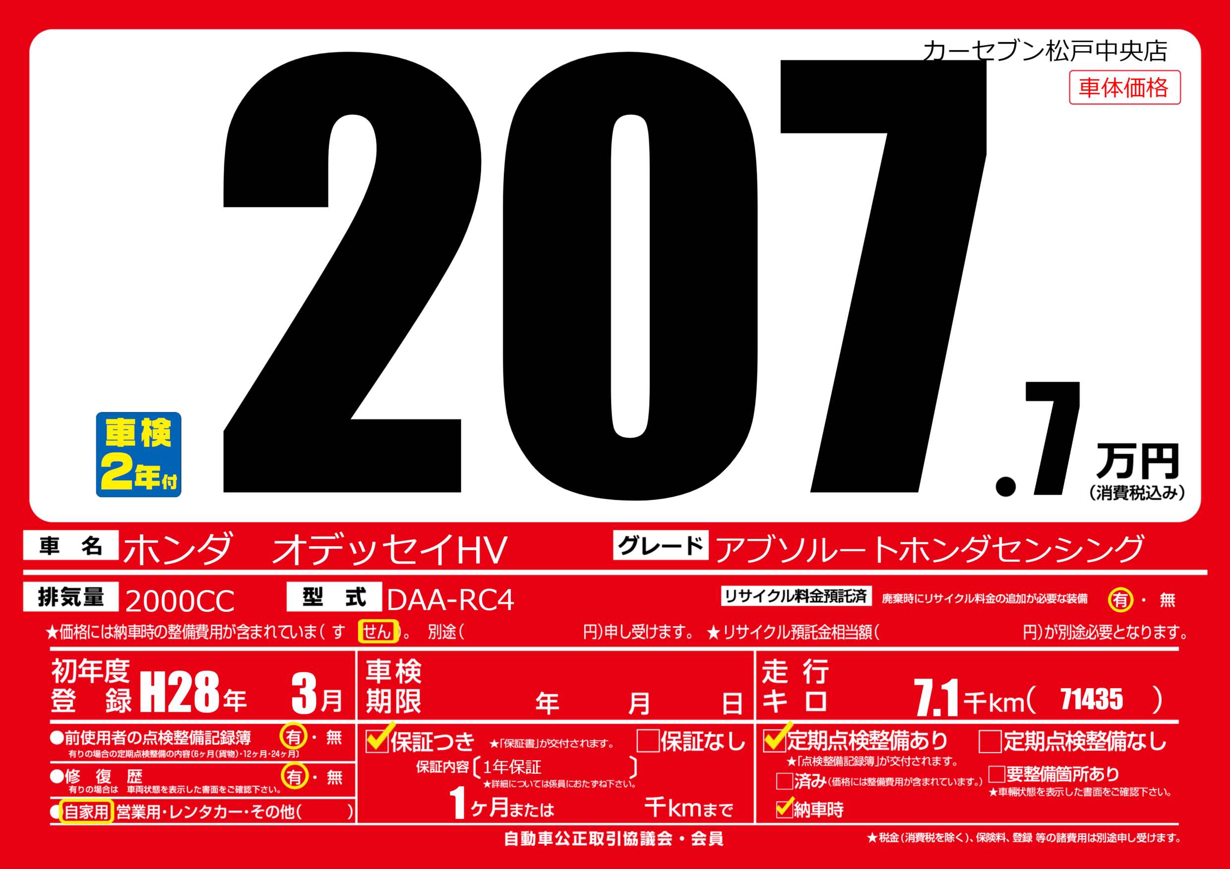 | 車名 | ホンダ オデッセイHV | グレード ミッション 排気量 |