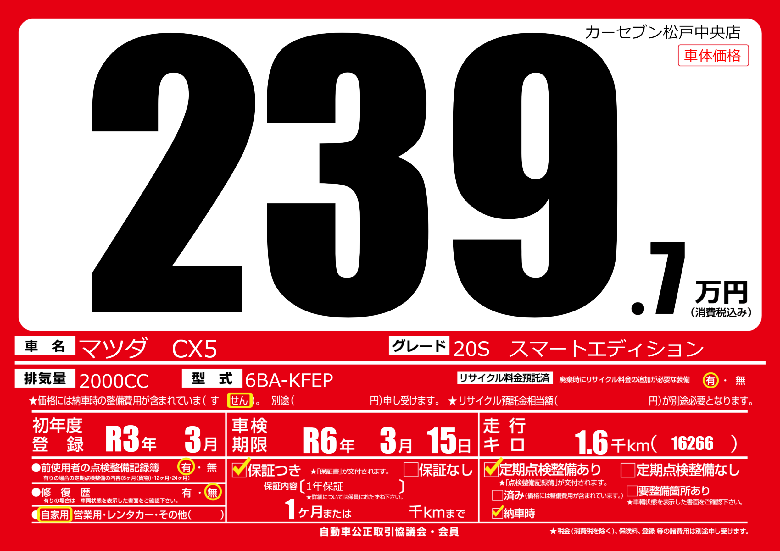 | 車名 | マツダ CX5 | グレード ミッション 排気量 |