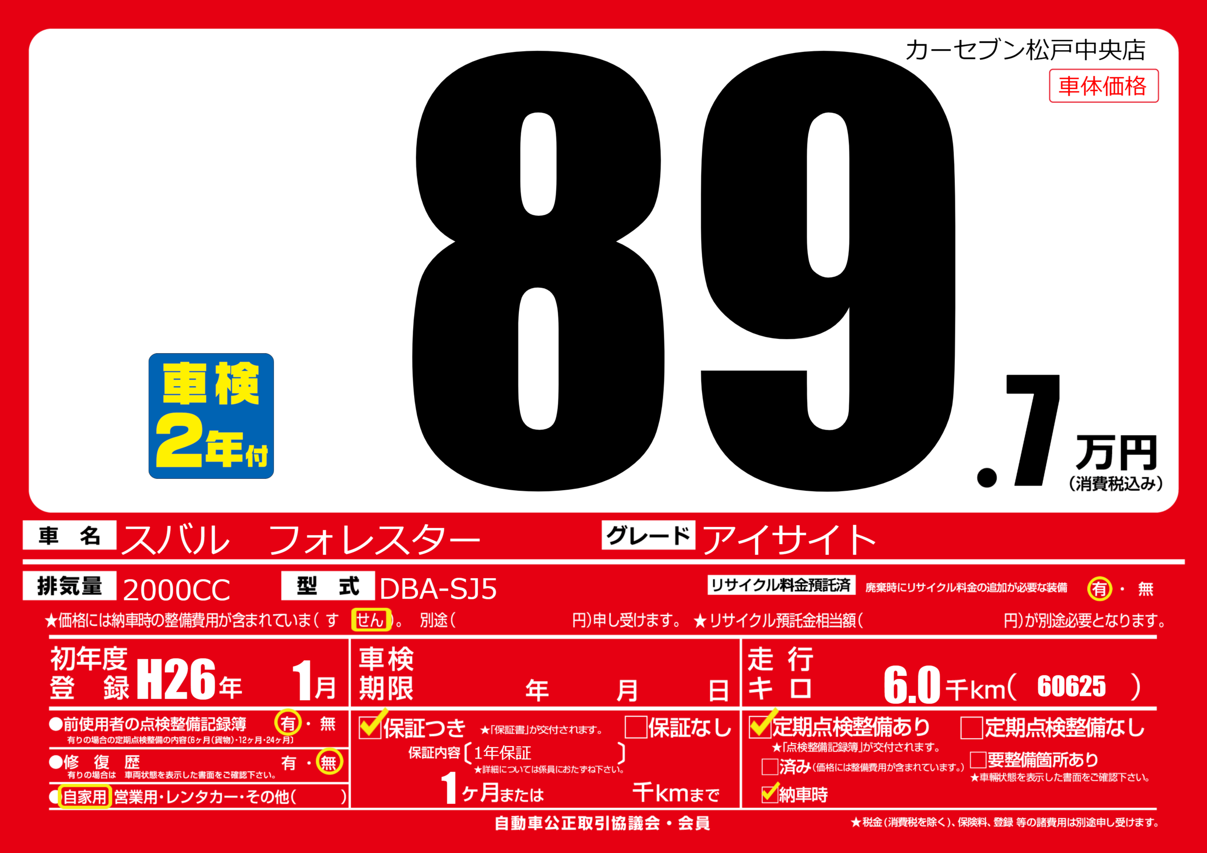| 車名 | スバル フォレスター | グレード ミッション 排気量 |
