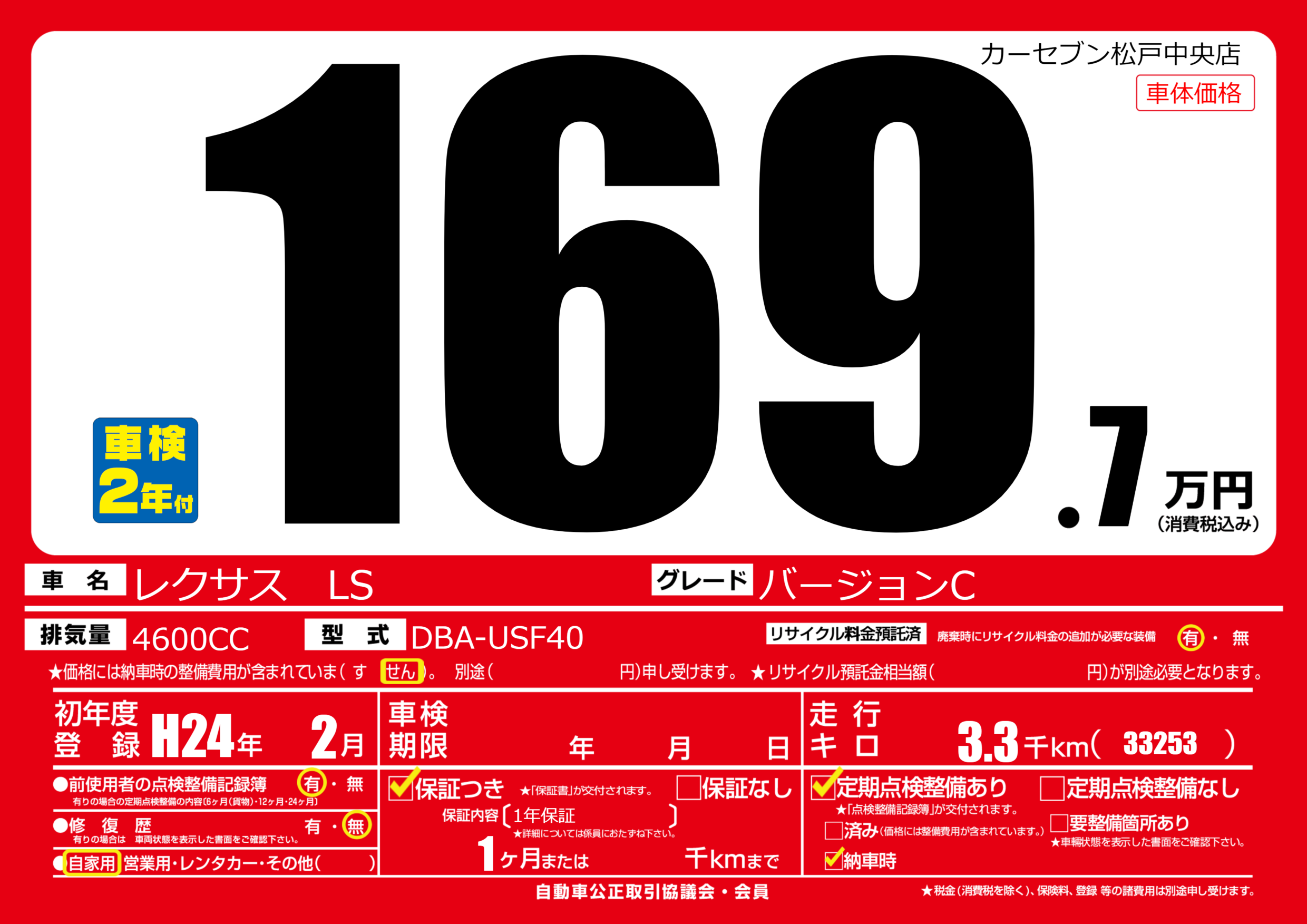 | 車名 | レクサス LS | グレード ミッション 排気量 |