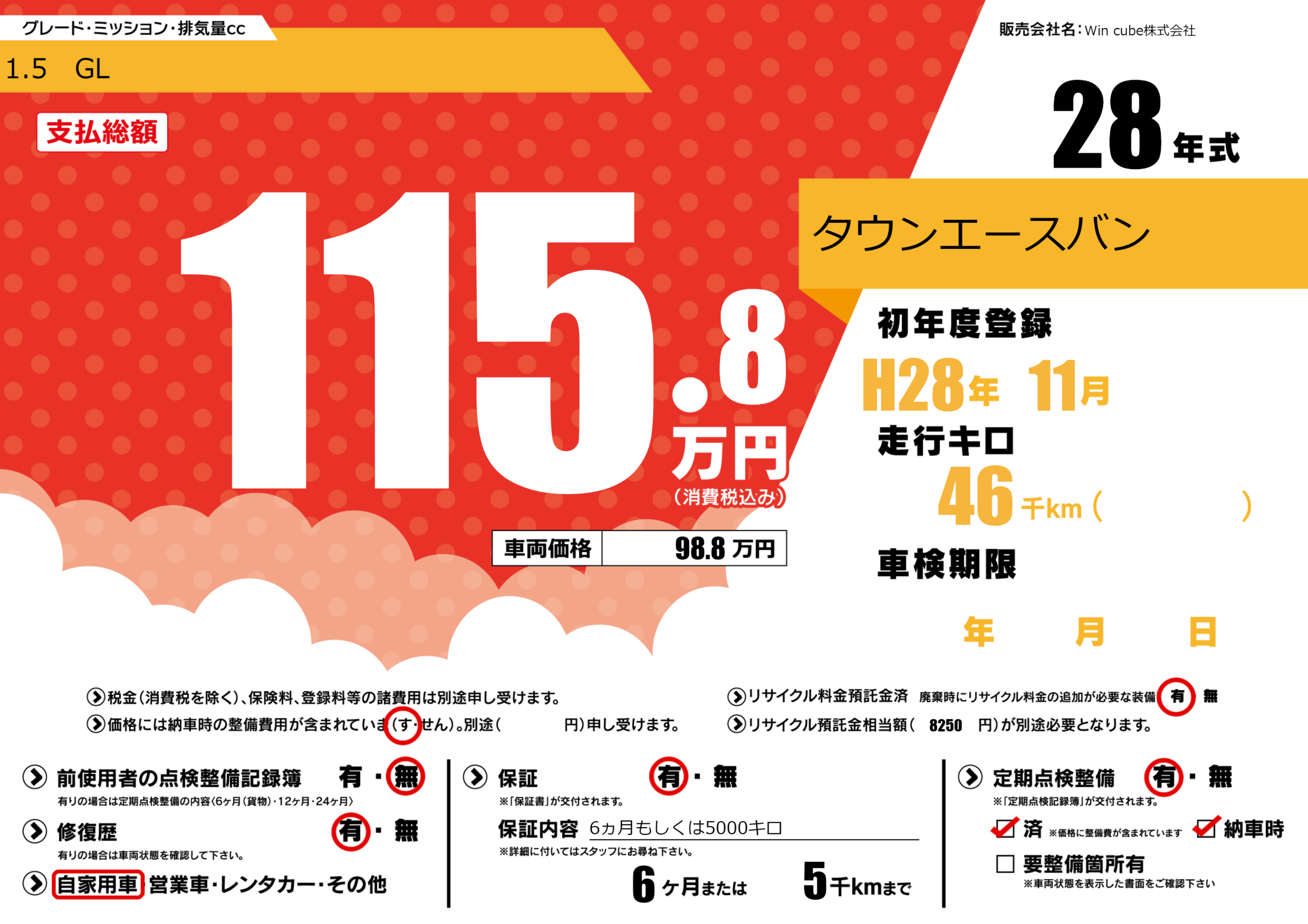 保証付き 保証内容(6ヵ月もしくは5000キロ) 6ヶ月または(5)千kmまで |