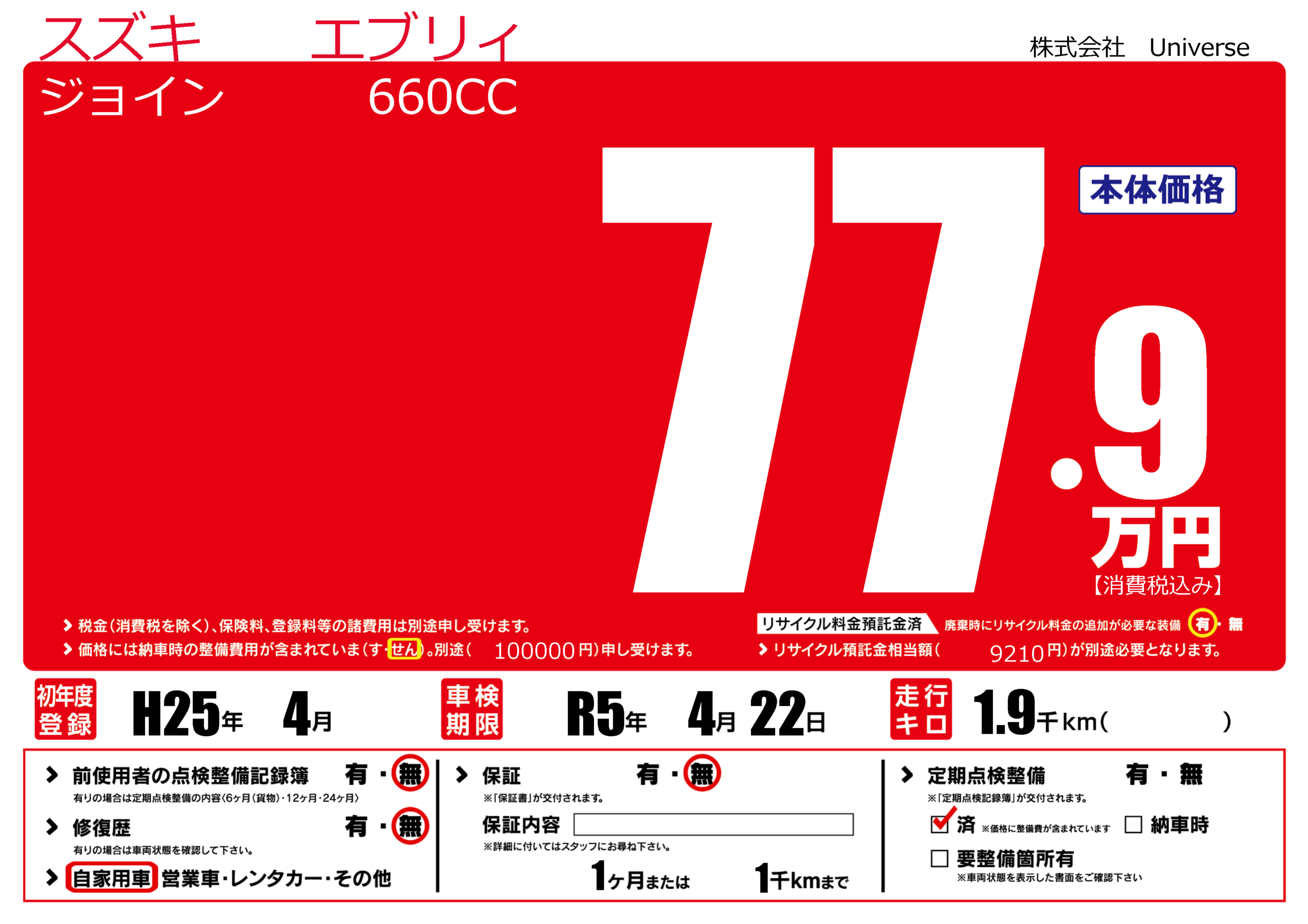 | 定期点検整備 | 定期点検整備済み | ||