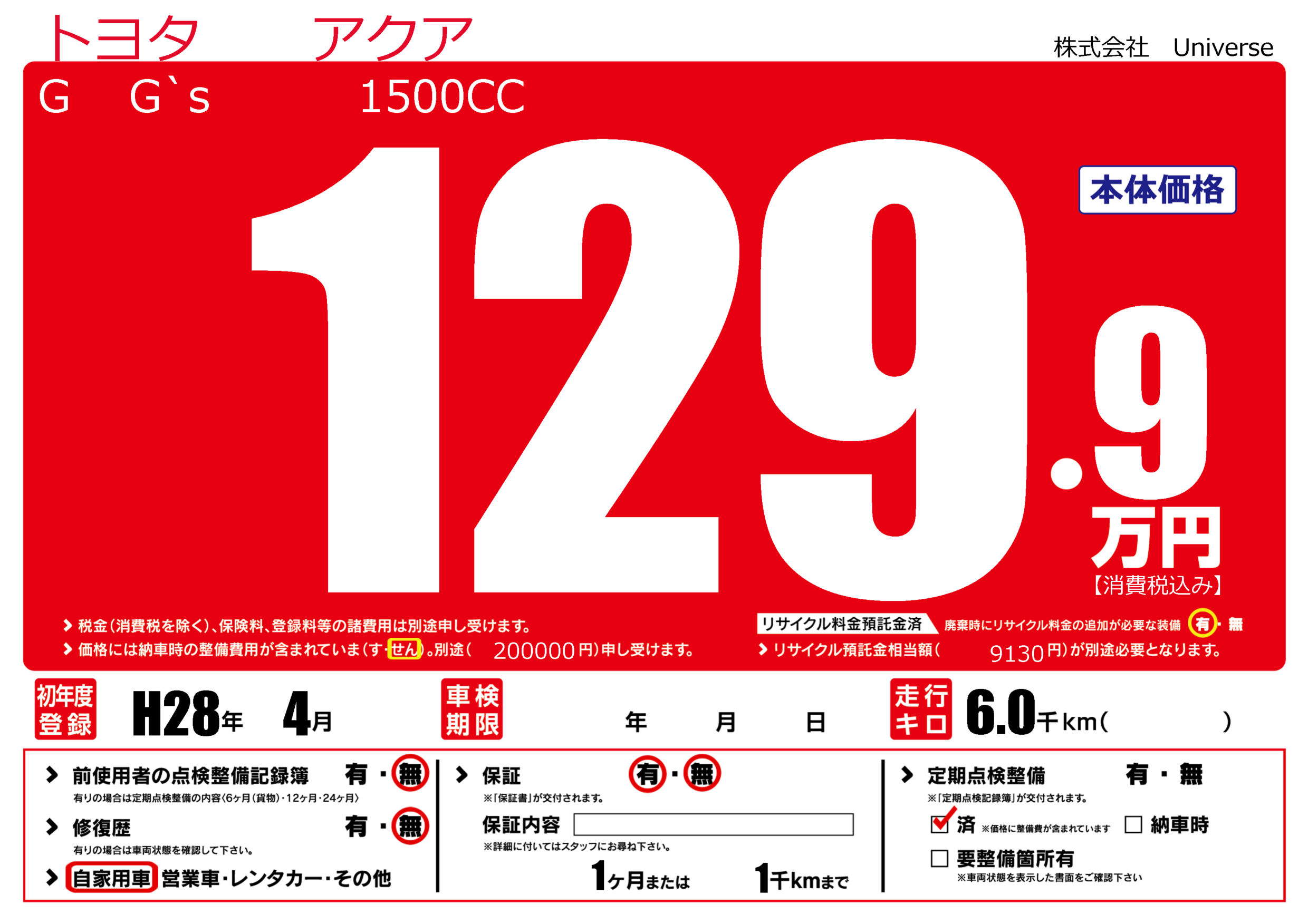 | 車名 | トヨタ アクア | グレード ミッション 排気量 |