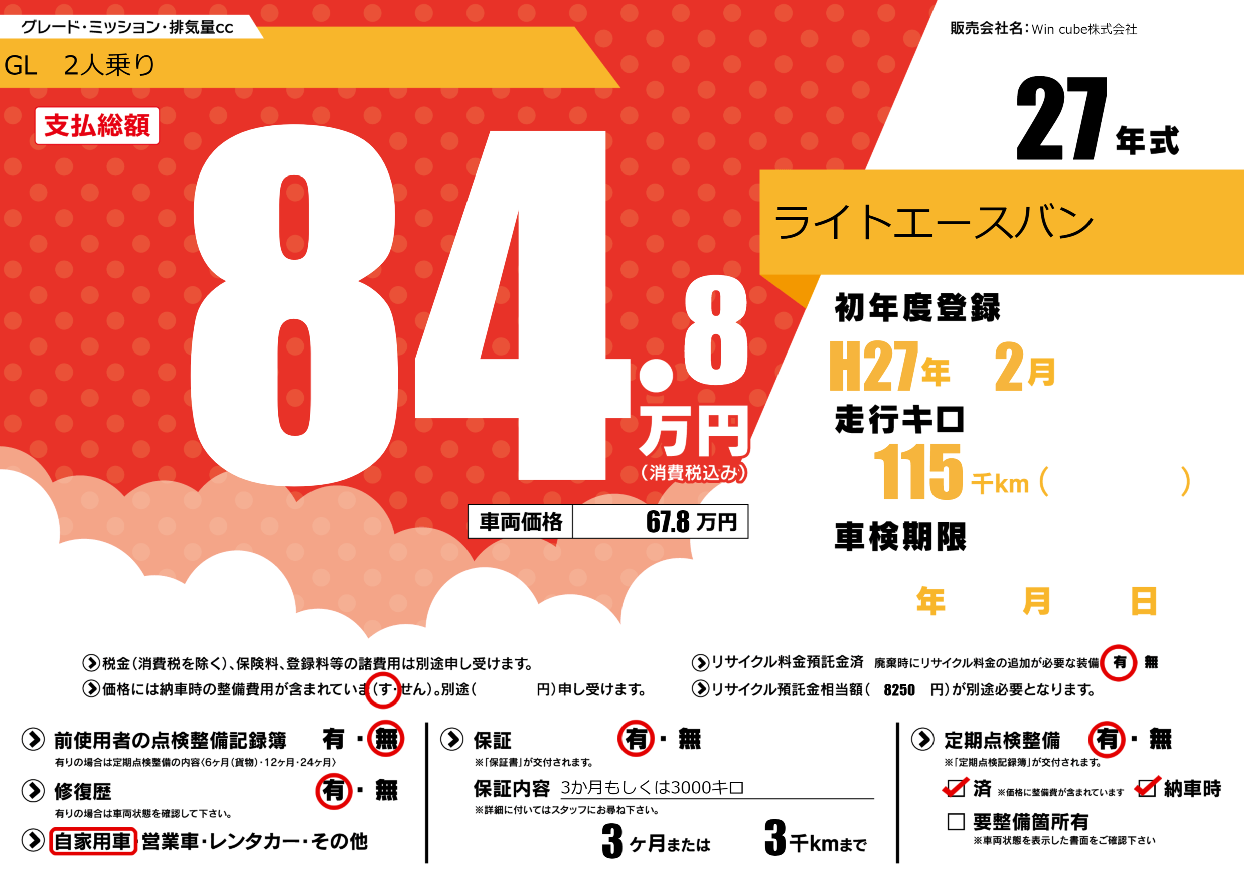 | 定期点検整備 | 定期点検整備あり 定期点検整備済み 納車時あり | ||