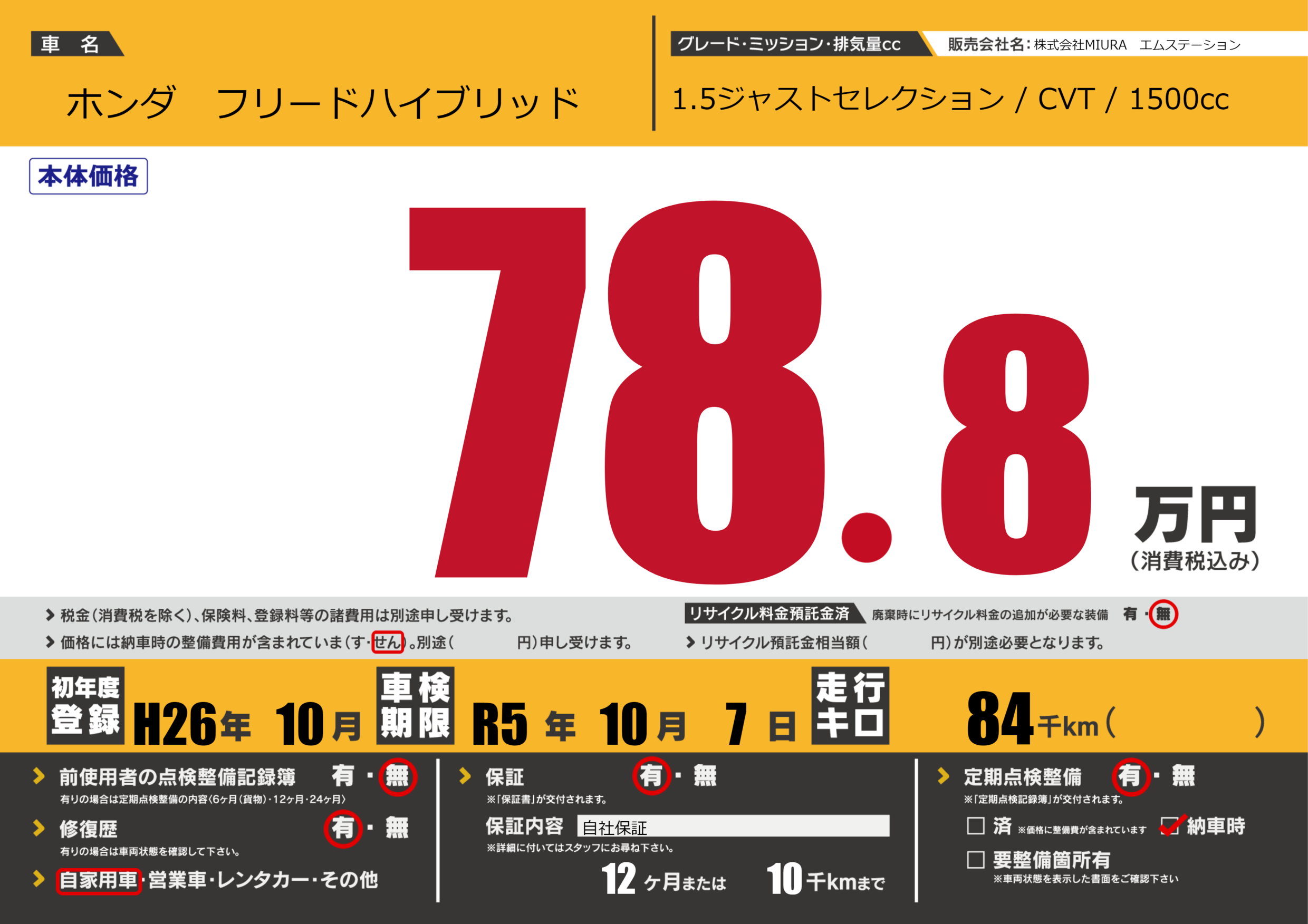 | 車名 | ホンダ フリードハイブリッド | グレード ミッション 排気量 |