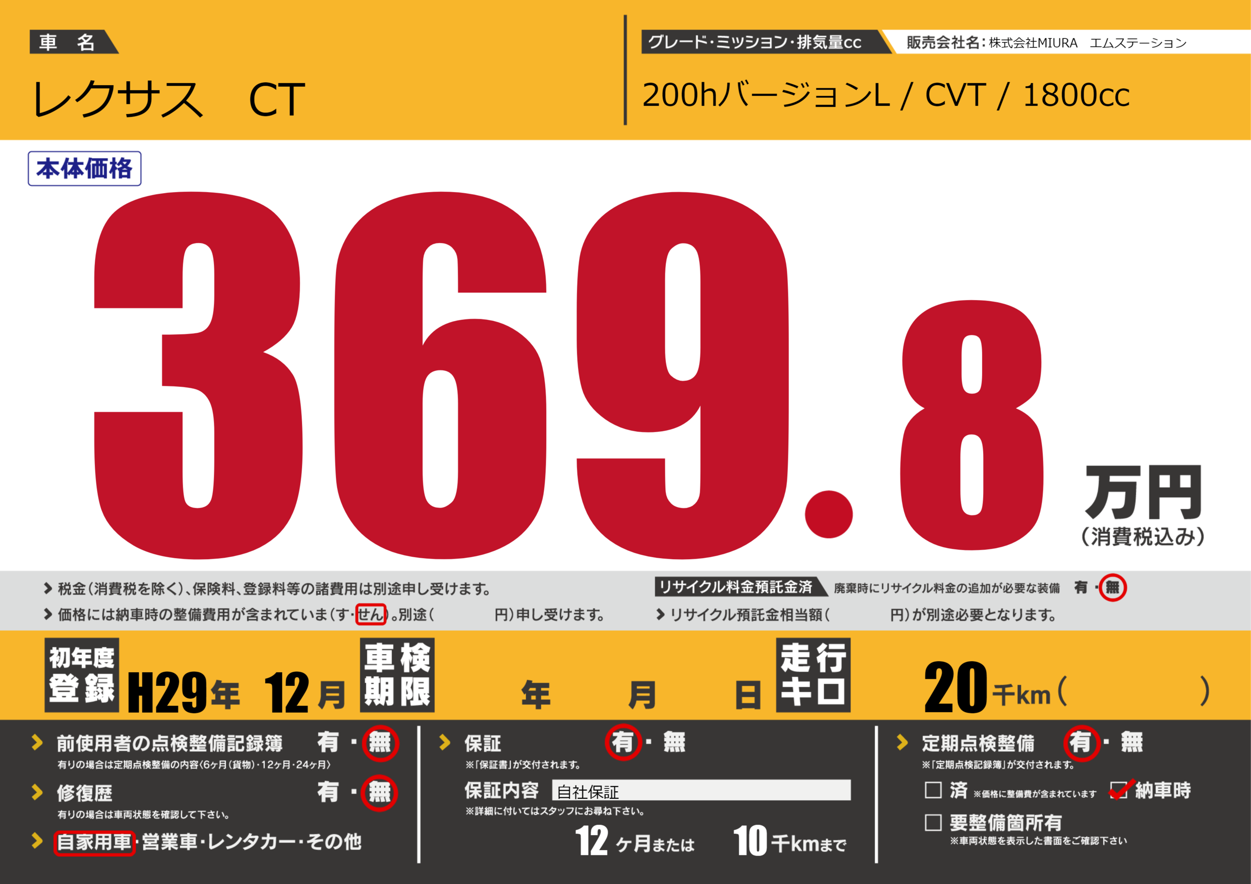 保証付き 保証内容(自社保証) 12ヶ月または(10)千kmまで |