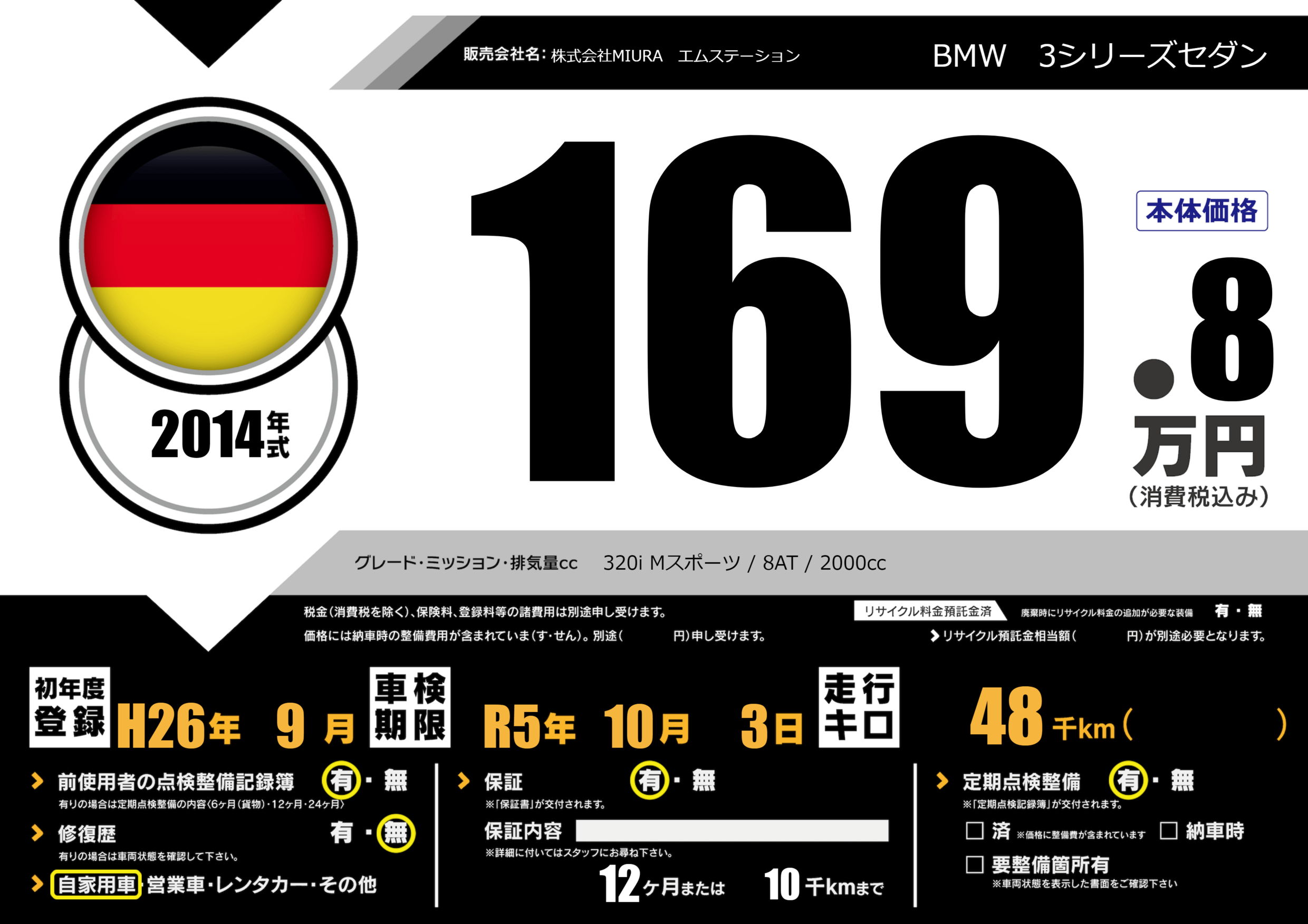 | 車名 | BMW 3シリーズセダン | グレード ミッション 排気量 |