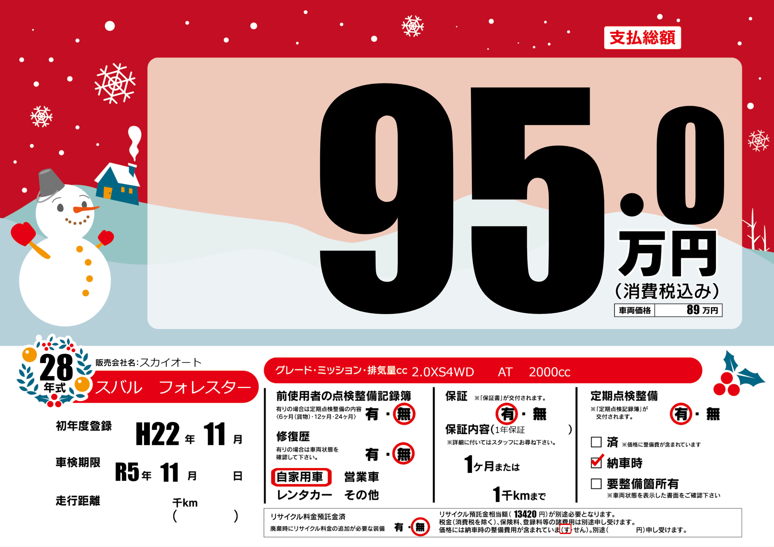 | 定期点検整備 | 定期点検整備あり 納車時あり | ||