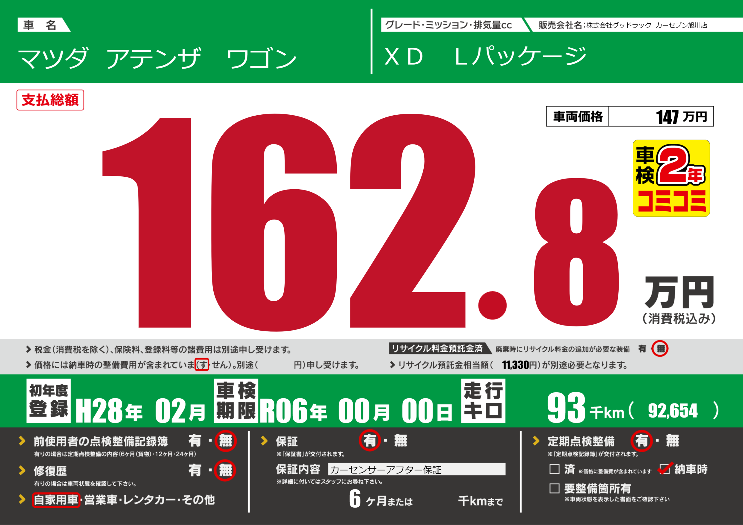 | 走行キロ | 9.3万km | 初年度登録 | H28年02月 |