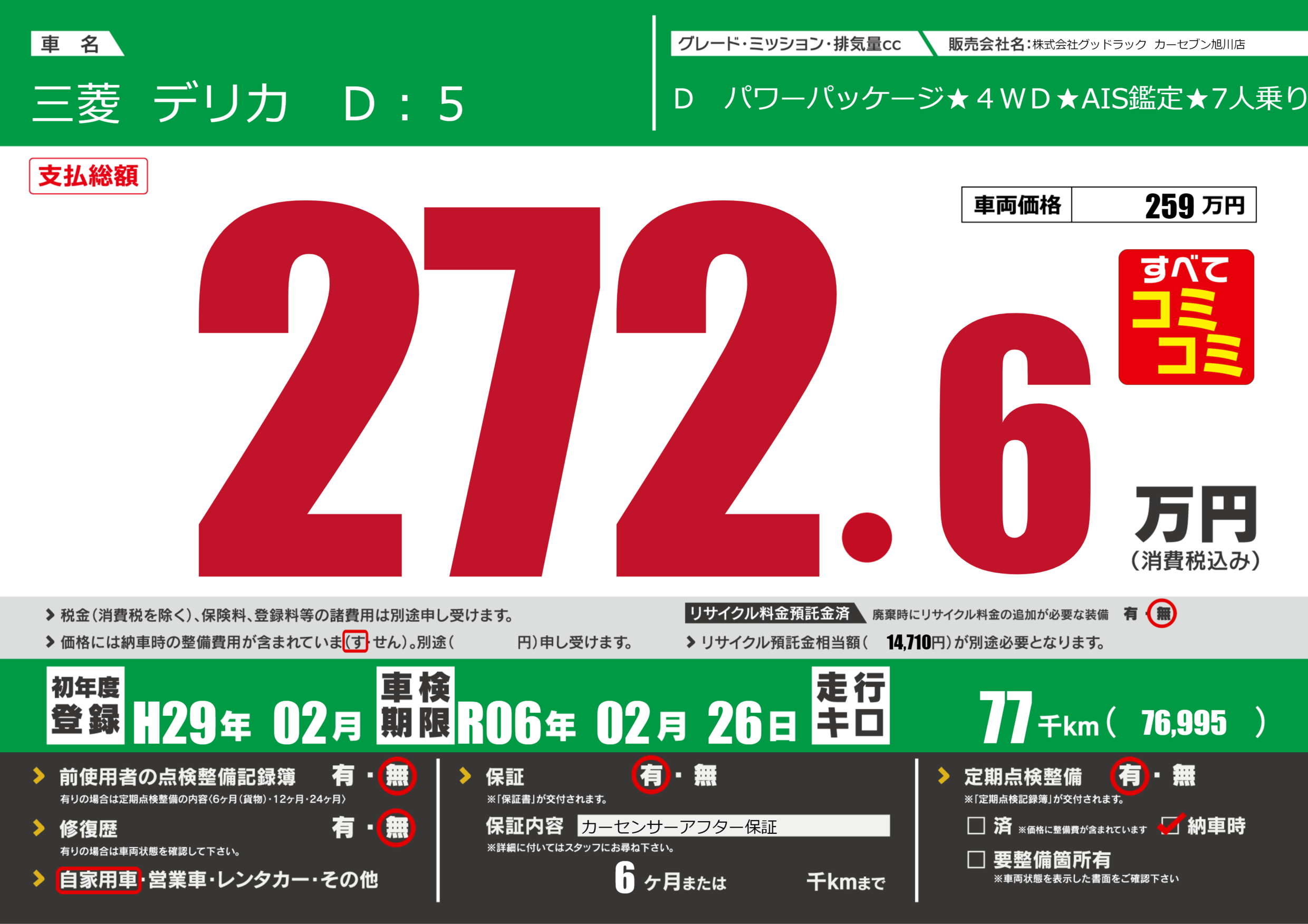 | 車名 | 三菱 デリカ D:5 | グレード ミッション 排気量 |
