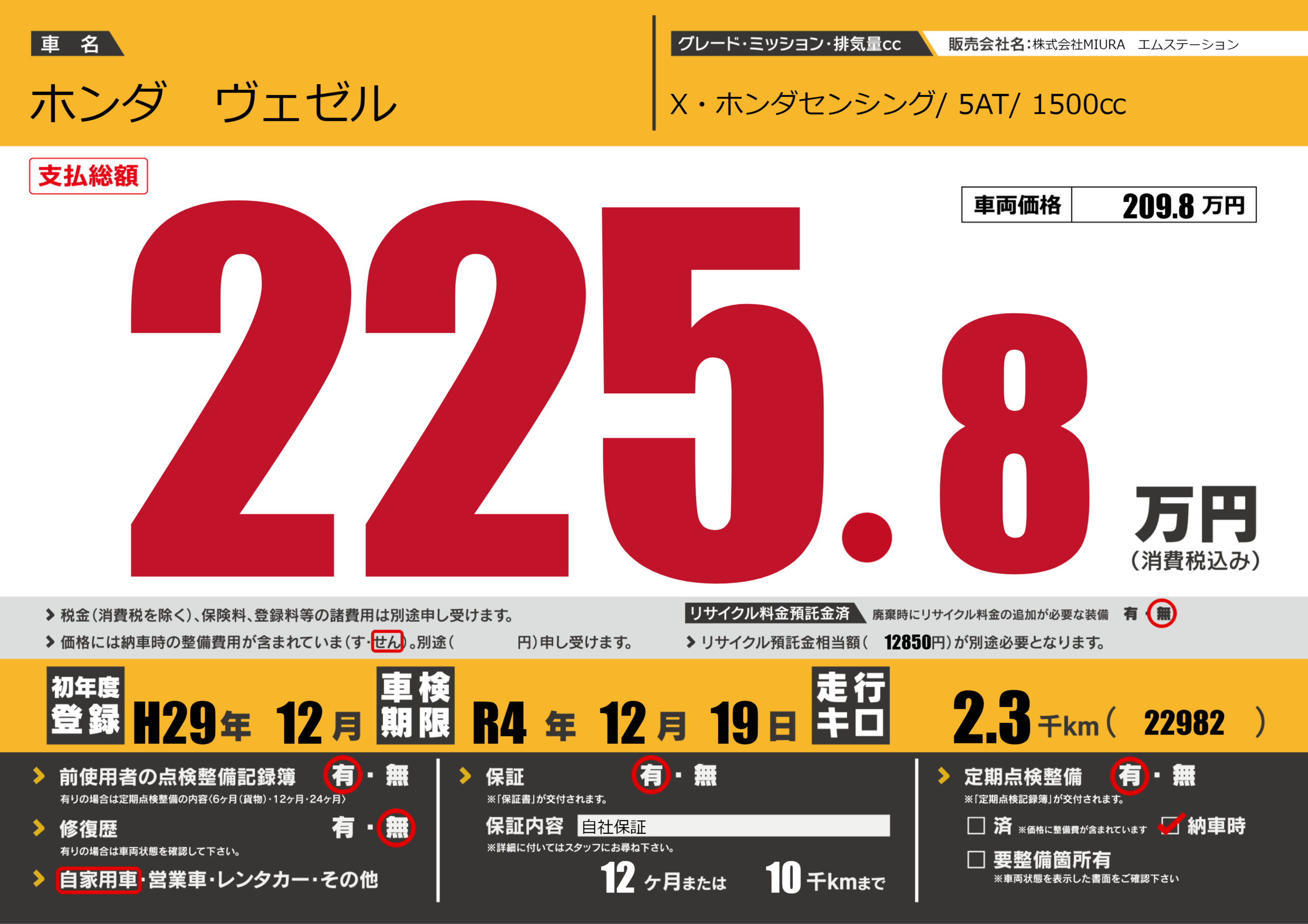 | 車名 | ホンダ ヴェゼル | グレード ミッション 排気量 |