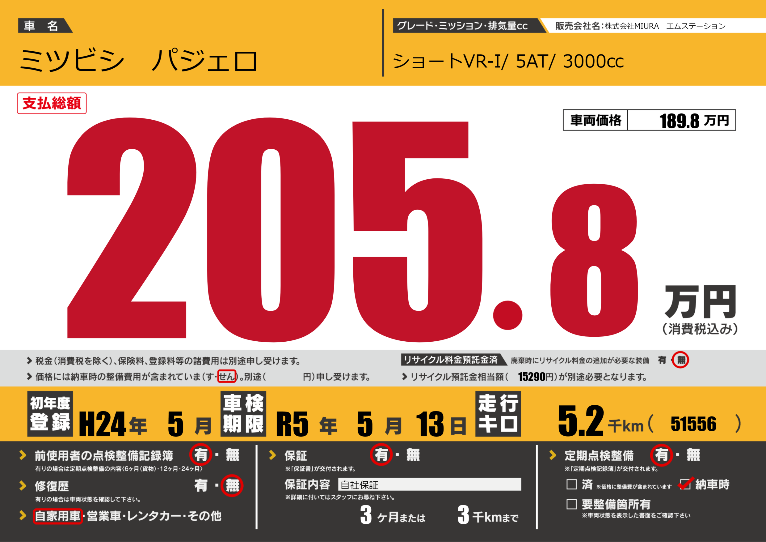 | 車名 | ミツビシ パジェロ | グレード ミッション 排気量 |