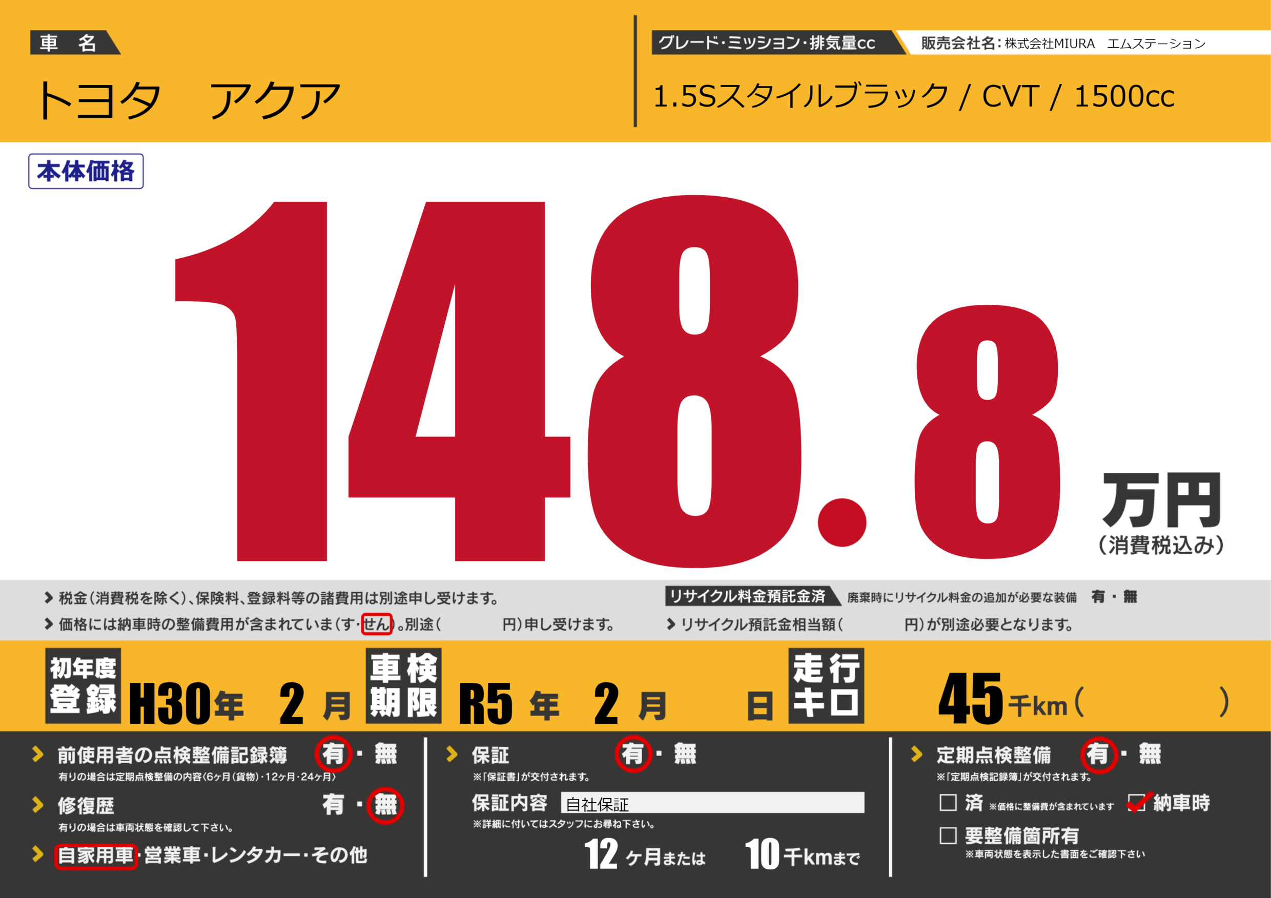保証付き 保証内容(自社保証) 12ヶ月または10千km |