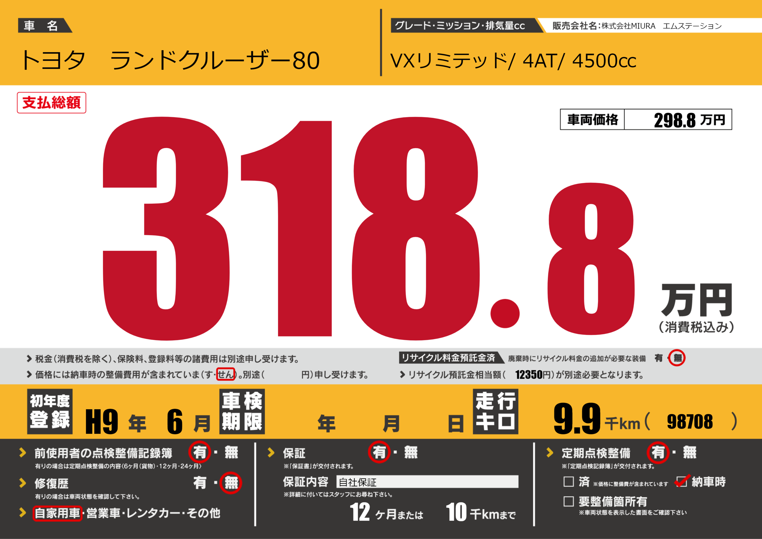 | 走行キロ | 0.9万km | 初年度登録 | H9年6月 |