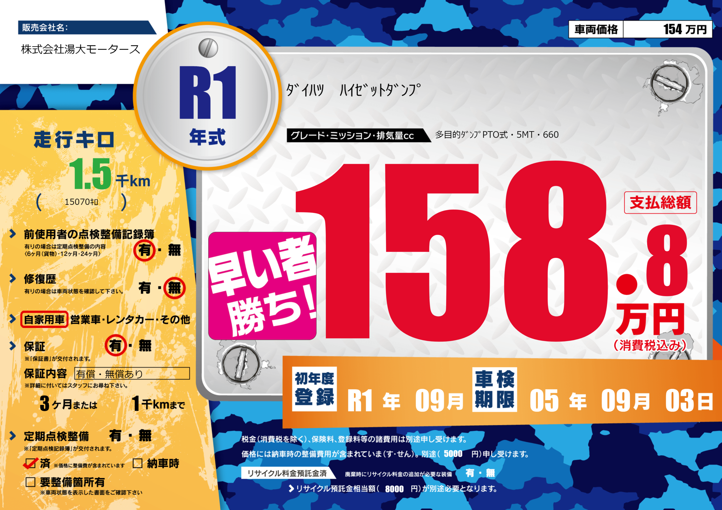 | 走行キロ | 0.1万km | 初年度登録 | R1年09月 |