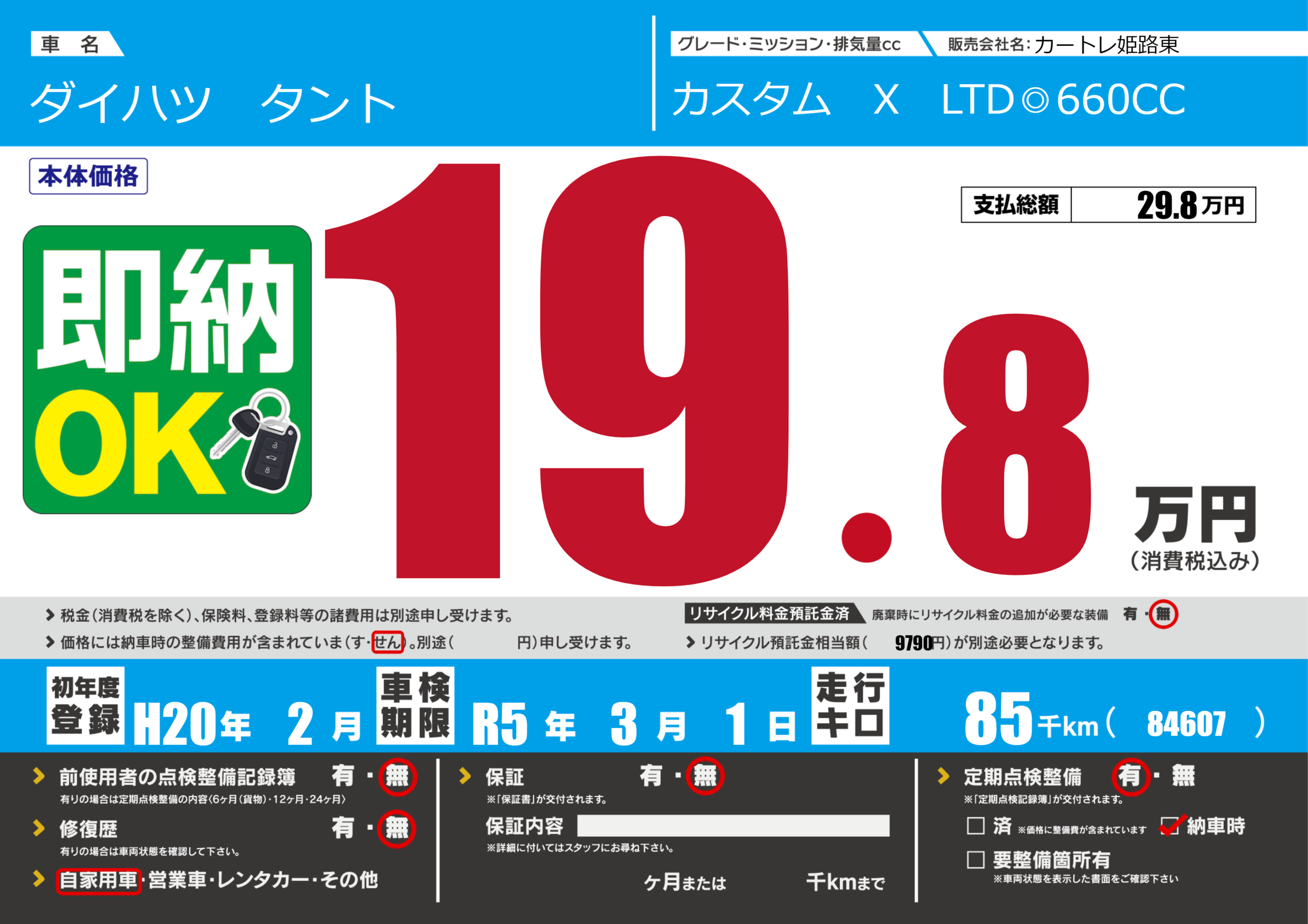 | 車名 | ダイハツ タント | グレード ミッション 排気量 |